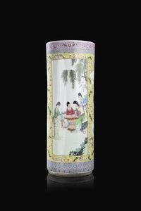 Porta bastoni in porcellana Famiglia Rosa con decori floreali e personaggi in giardino entro riserve Cina Repubblica [..]