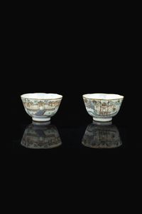 Coppia di tazzine Famigia Rosa decorate con tempio e iscrizioni Cina dinastia [..]