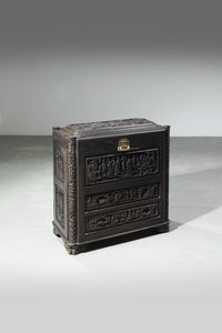 Mobiletto cinese in legno con apertura a ribalta intarsiato con scene portuali Cina dinastia Qing XIX Sec. [..]