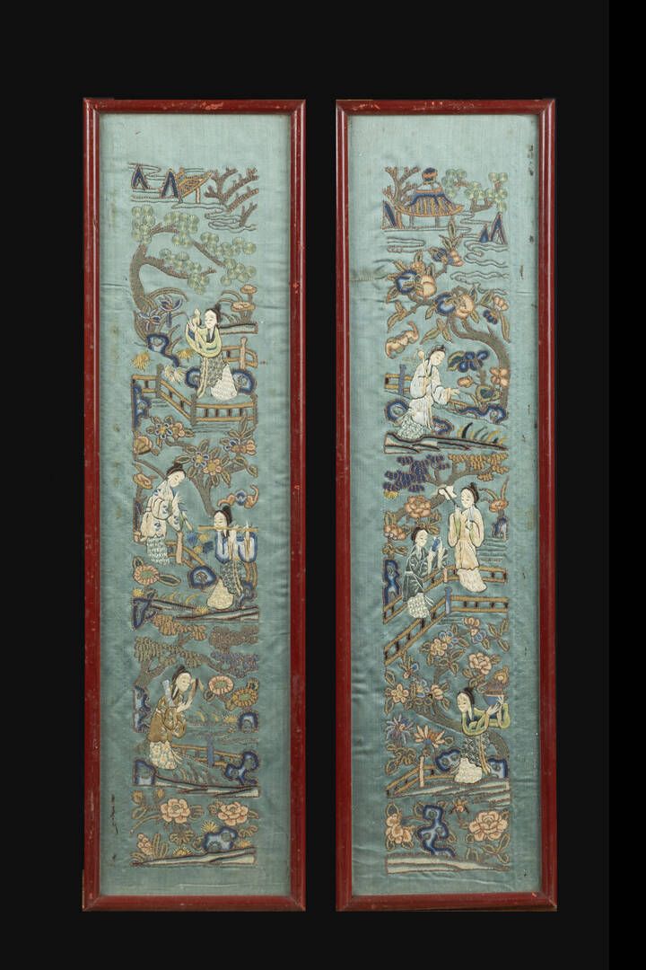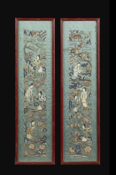 Coppia di ricami rappresentanti figure in giardino Cina Repubblica XX Sec. 56x16 [..]
