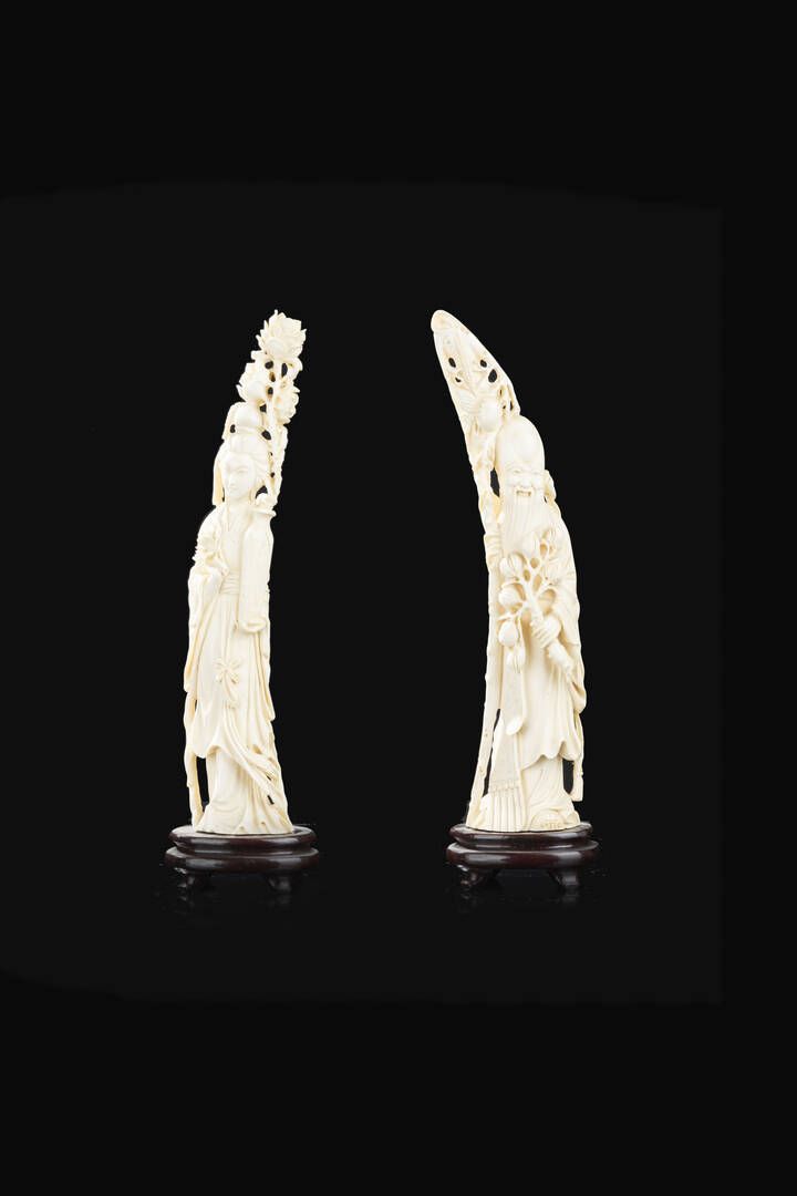 Coppia di statue raffiguranti Peng Zu e ragazza con fiori in testa. Cina Repubblica XX Sec. 29x7 cm Presente certificazione CITES originale.