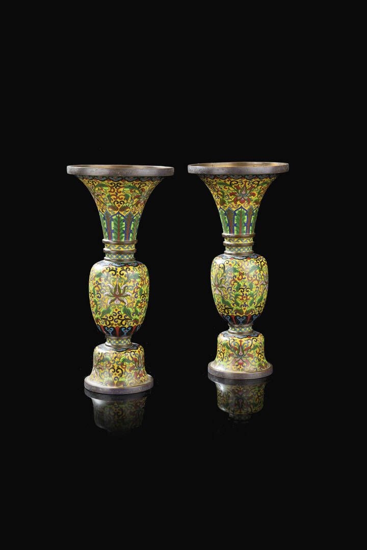 Coppia di vasi a tromba in cloissonè a motivi floreali Cina dinastia Qing XIX Sec. 31x15 cm