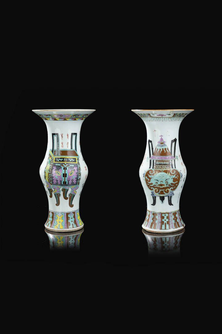 Coppia di vasi in porcellana Famiglia Rosa decorate con incensieri e iscrizioni Cina dinastia Qing XIX Sec. 37 5x19 5cm