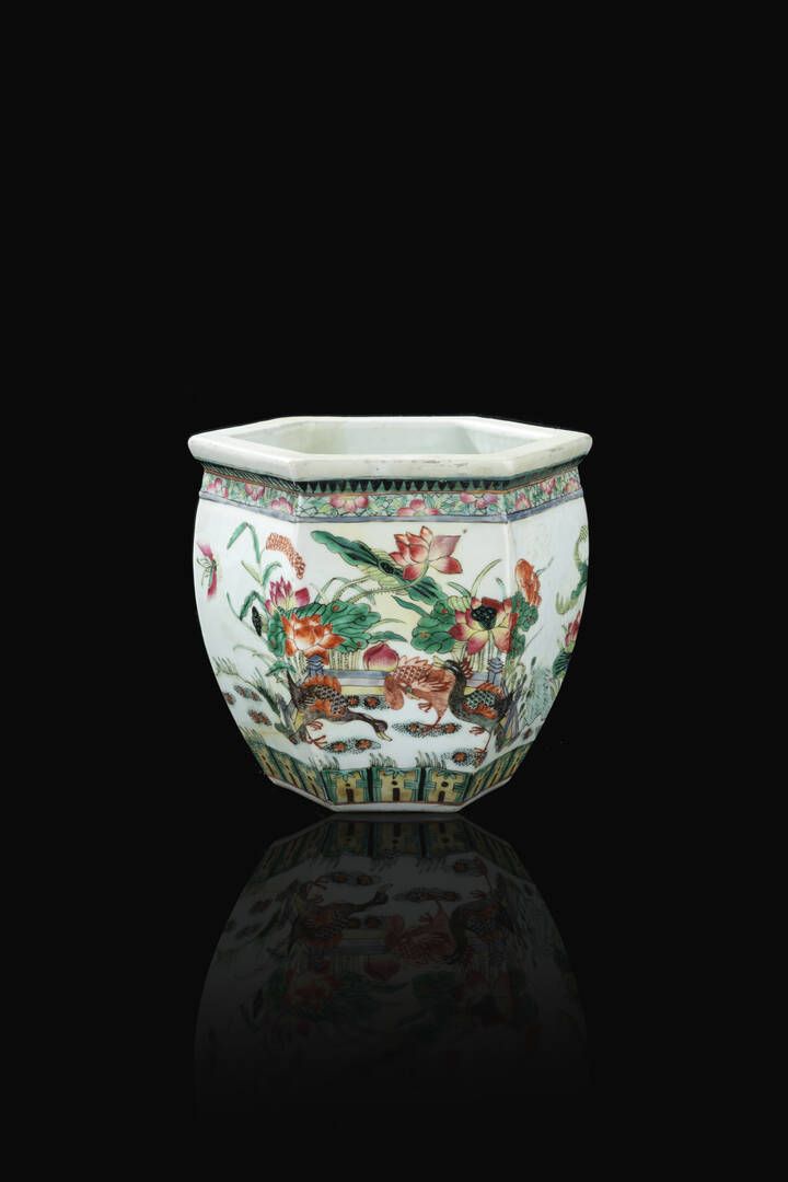 Giardiniera in porcellana Famiglia Verde decorata con anatre fiori e farfalle Cina dinastia Qing XIX Sec. 20 5x23 cm