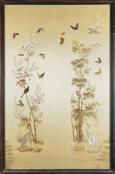 Ricamo finemente decorato su seta adornato con uccelli e farfalle tra rami di bambù [..]