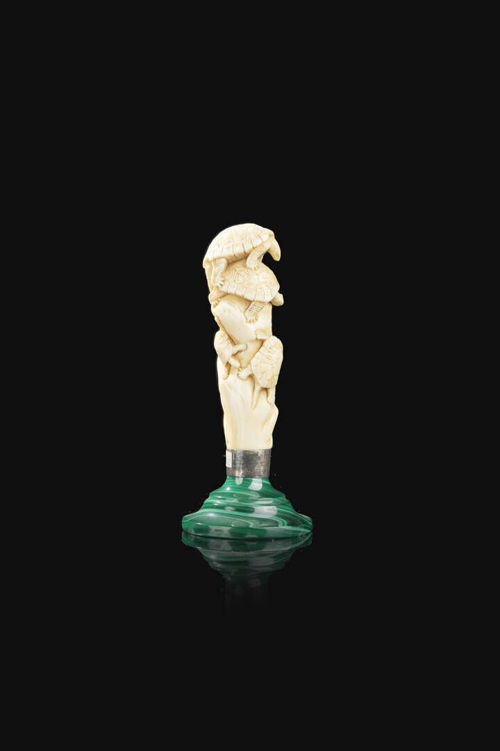 Scultura in avorio rappresentante colonnina di tartarughe su roccia montato su piedistallo in malachite Giappone inizi XX Sec. 16x6 5 cm Presente certificazione CITES originale.