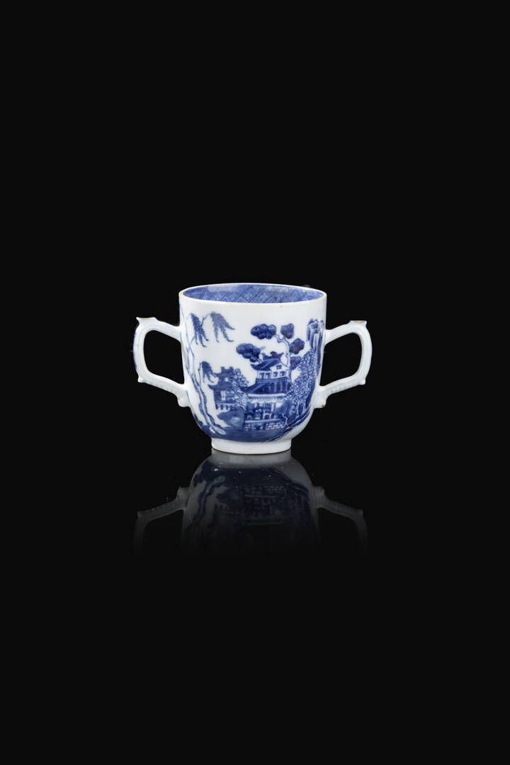 Tazzina in porcellana bianca e blu con manici decorata con paesaggio Cina dinastia [..]