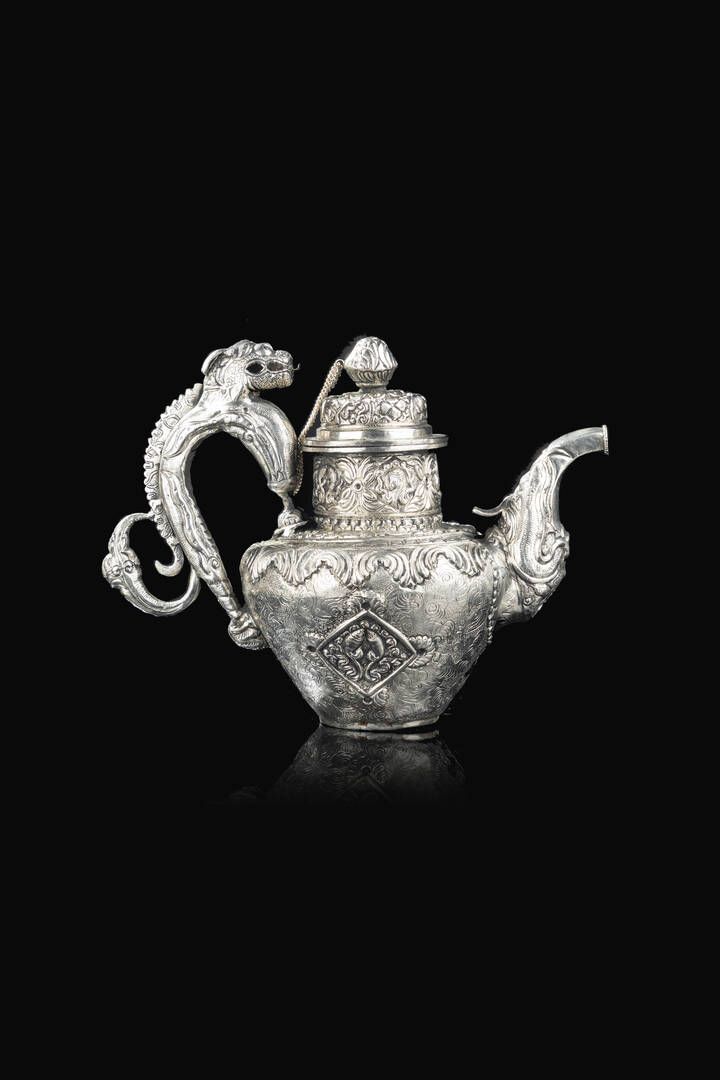 Teiera in rame argentato finemente sbalzata con manico a forma di drago Tibet inizi XX Sec. 25 5x34 cm