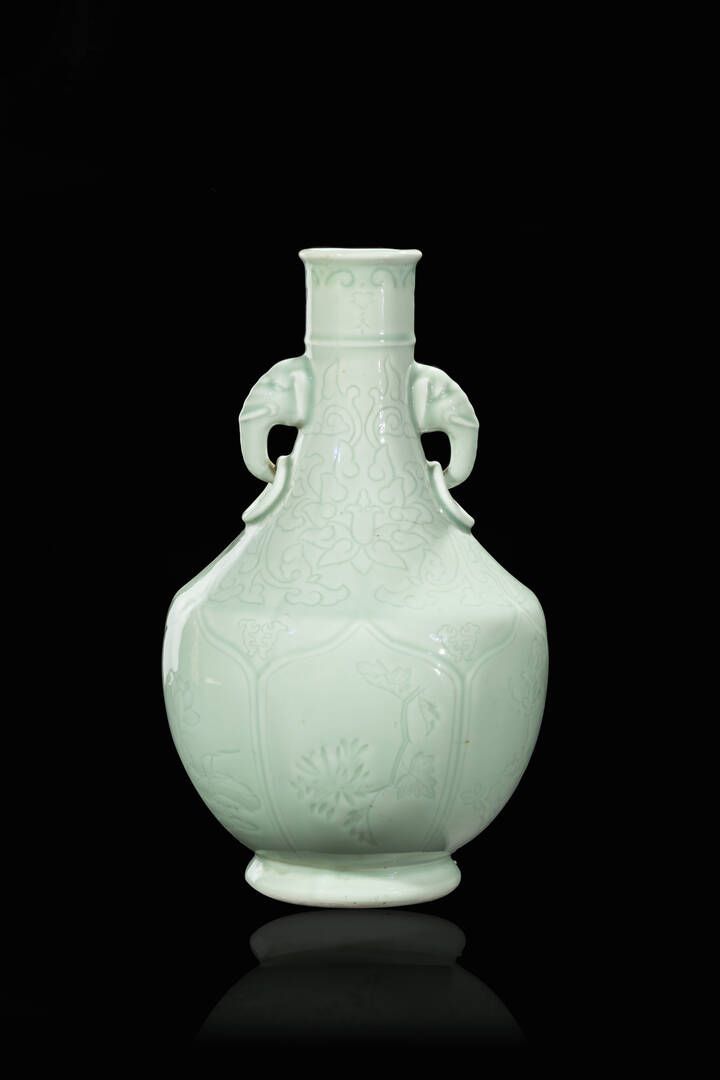 Vaso in porcellana Celadon dipinto con decori floreali e manici a forma di elefante [..]