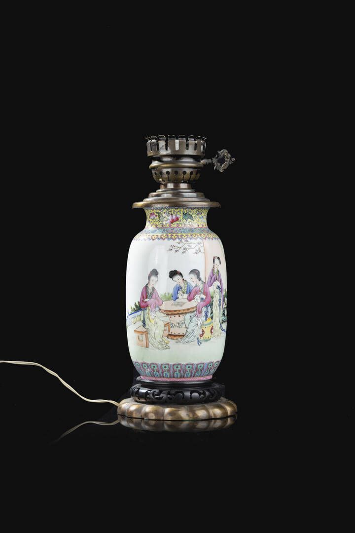 Vaso in porcellana Famiglia Rosa decorato con personaggi in giardino Cina Repubblica XX Sec. (montato a lampada) 34 5x12 cm