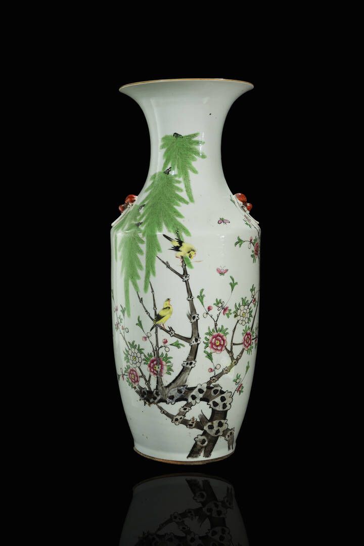 Vaso in porcellana Famiglia Rosa decorato con uccelli su rami di pesco Cina dinastia Qing XIX Sec. 58x23 cm