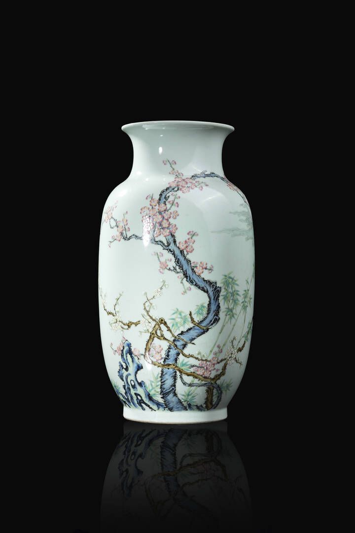 Vaso in porcellana Famiglia Rosa decorato con fiori di ciliegio e luna Cina Repubblica XX Sec. Marchio apocrifo Qianlong (1735-1795) 36x18 cm