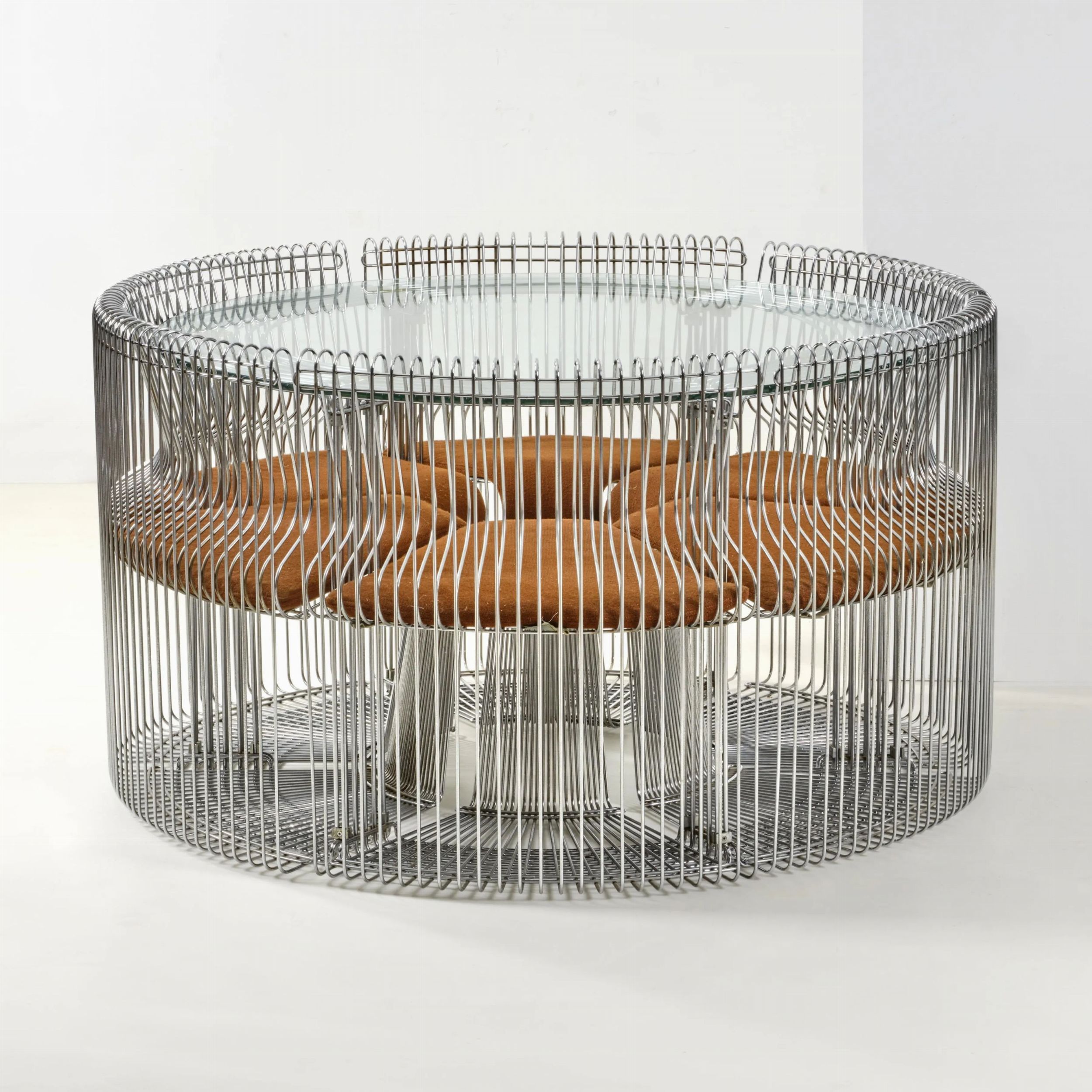 «120U» TABLE AND SIX «120S» CHAIRS FROM THE «PANTONOVA» SERIES, METAL STRUCTURE, GLASS TOP, BROWN FABRIC UPHOLSTERY