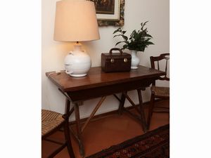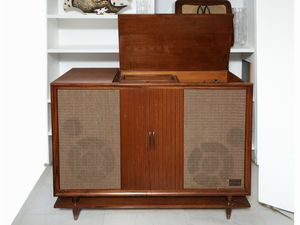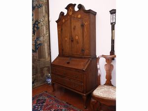 h cm 26x30x22 seconda metà del XIX secolo intarsiata con filettature in ottone, contenente quattro flaconi e quindici [..]