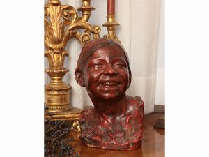 h cm 32x33x20 XVIII/XIX secolo gruppo in terracotta policroma raffigurante a tutto tondo il santo tra due devote, [..]