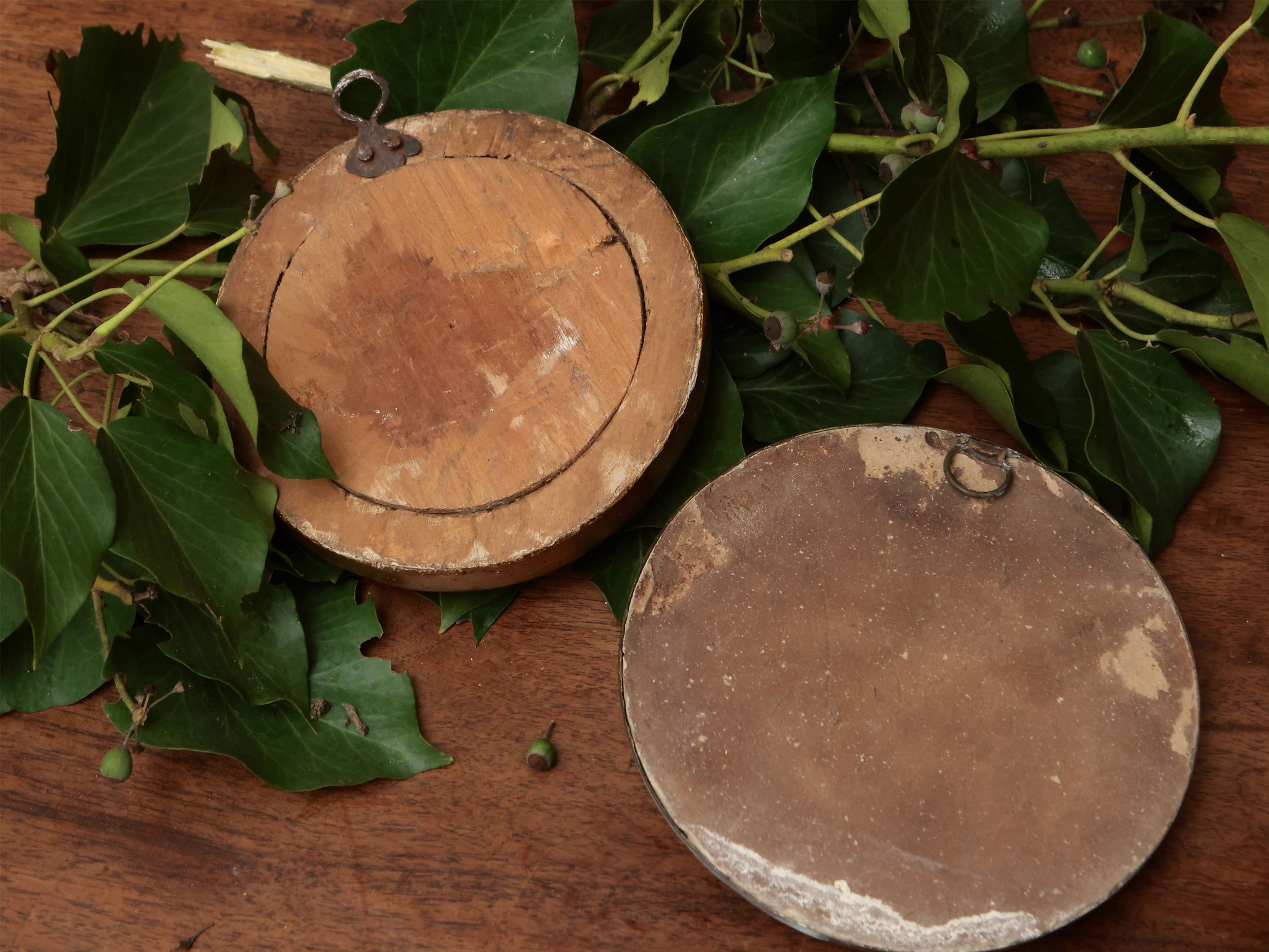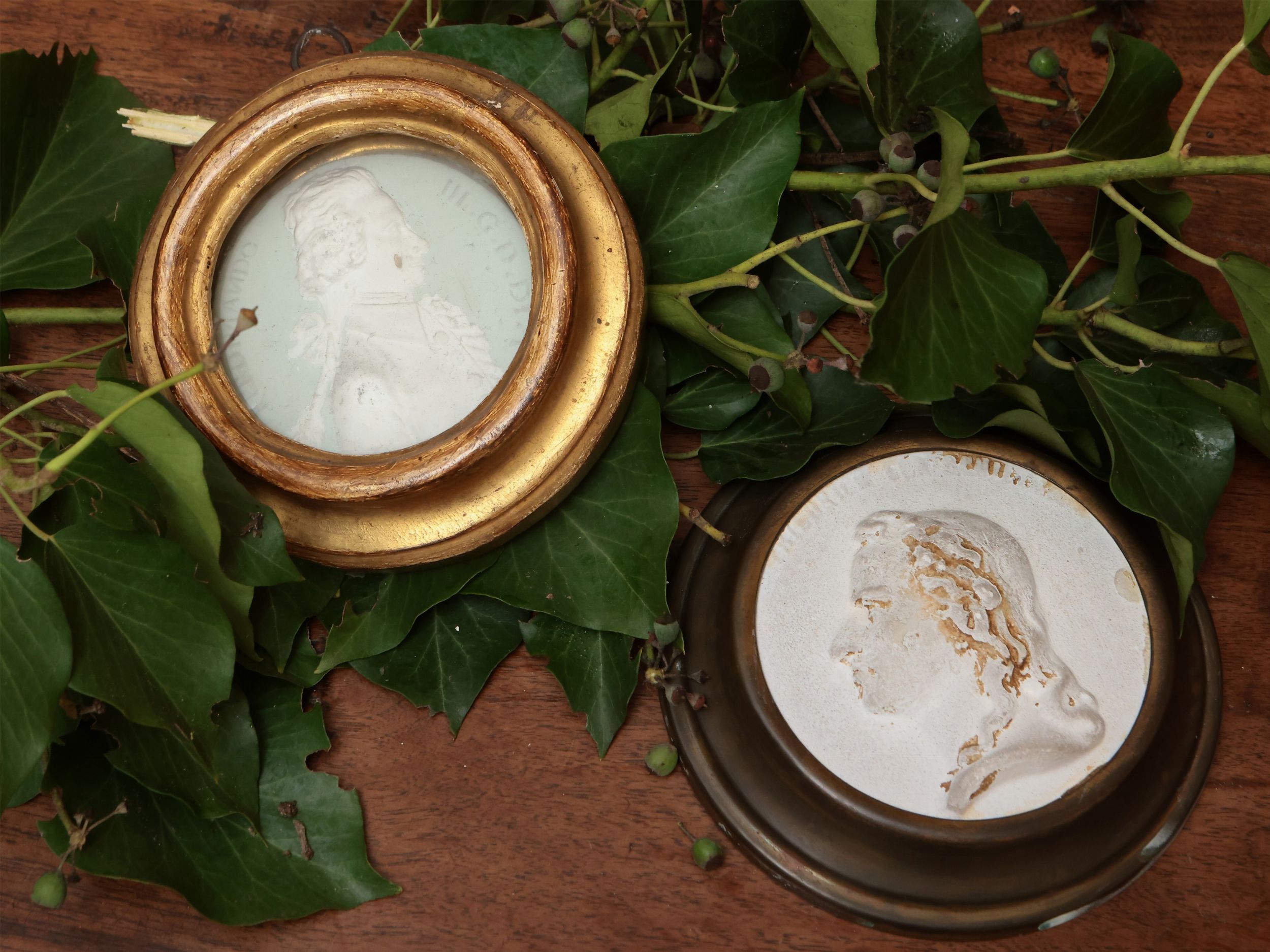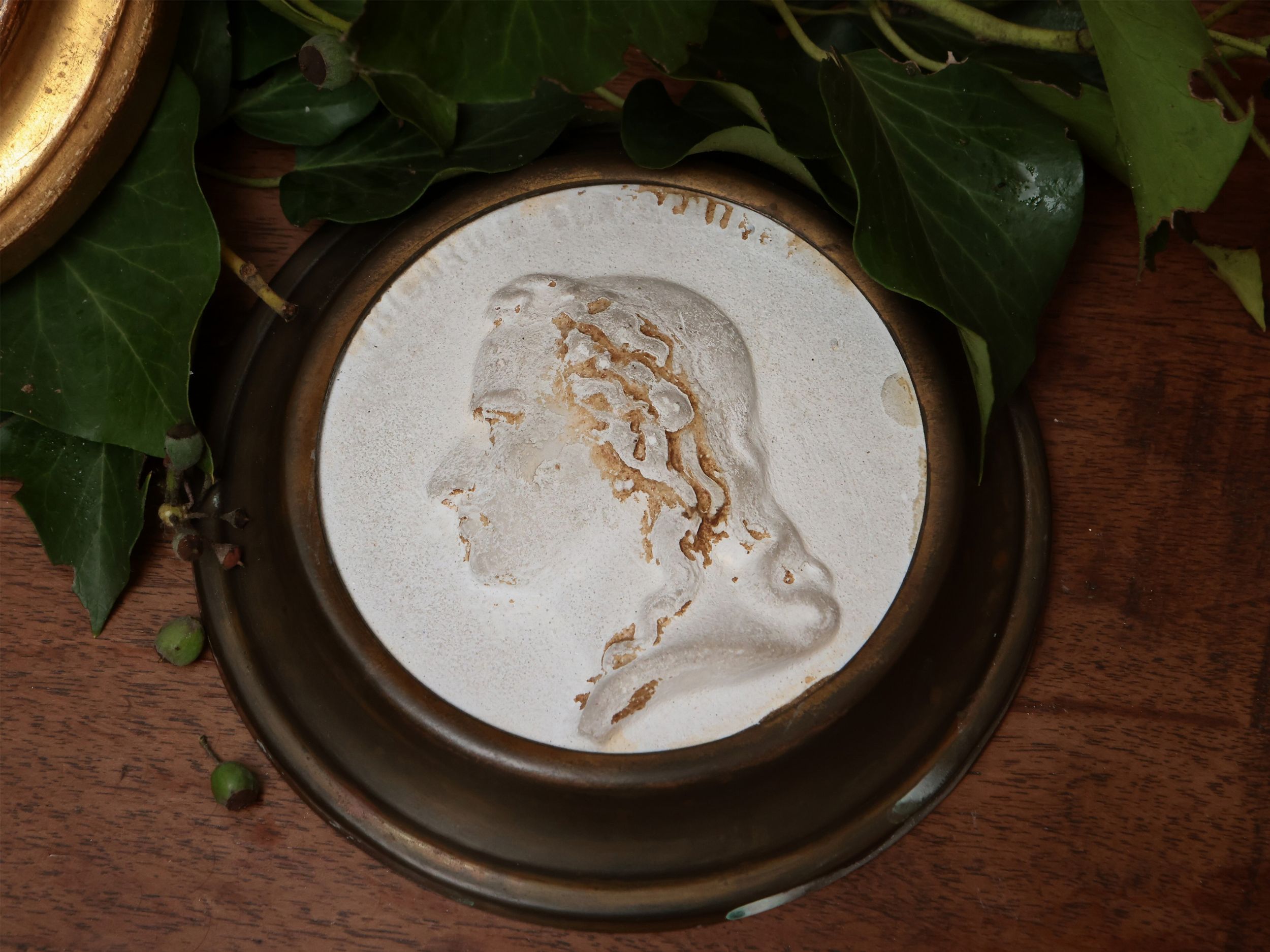 XVIII/XIX secolo medaglione in stucco, in cornice coeva (ridorata), abbinato ad un altro in stucco con profilo virile non identificato, in cornice in ottone (applicata)