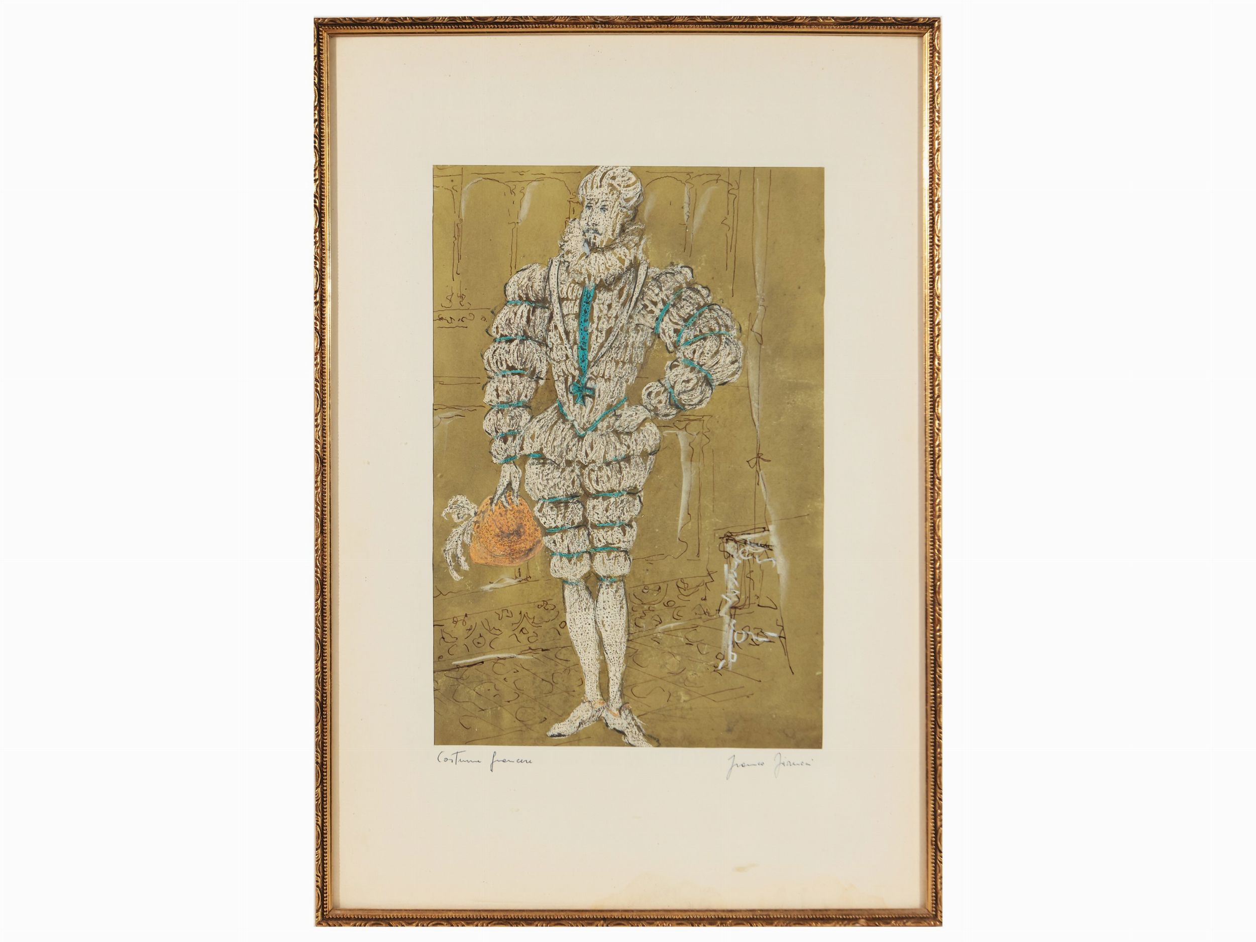 XX secolo bozzetti di costumi settecenteschi e francesi, pastelli, acquerelli e china su carta, firmati, in cornice