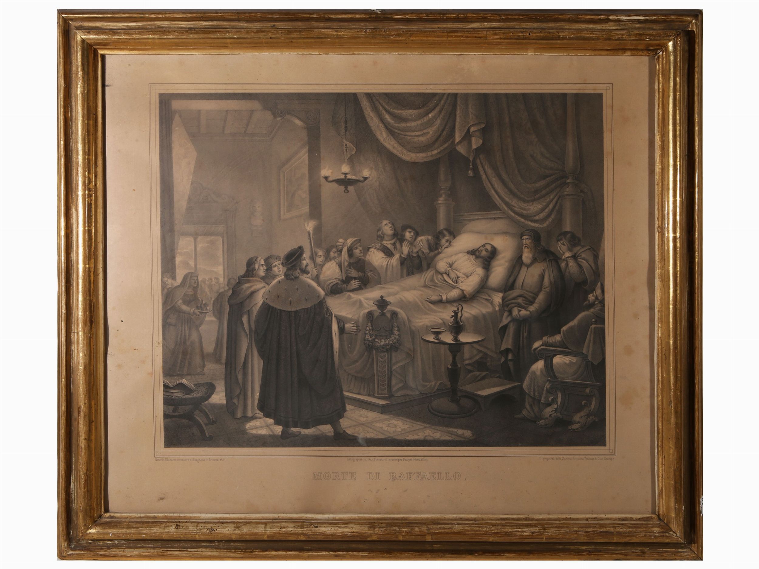 XIX secolo raffiguranti La morte di Raffaello, Michelangelo Buonarroti, Galileo offre al veneto senato il suo cannocchiale e Colombo, in cornice, alcuni difetti