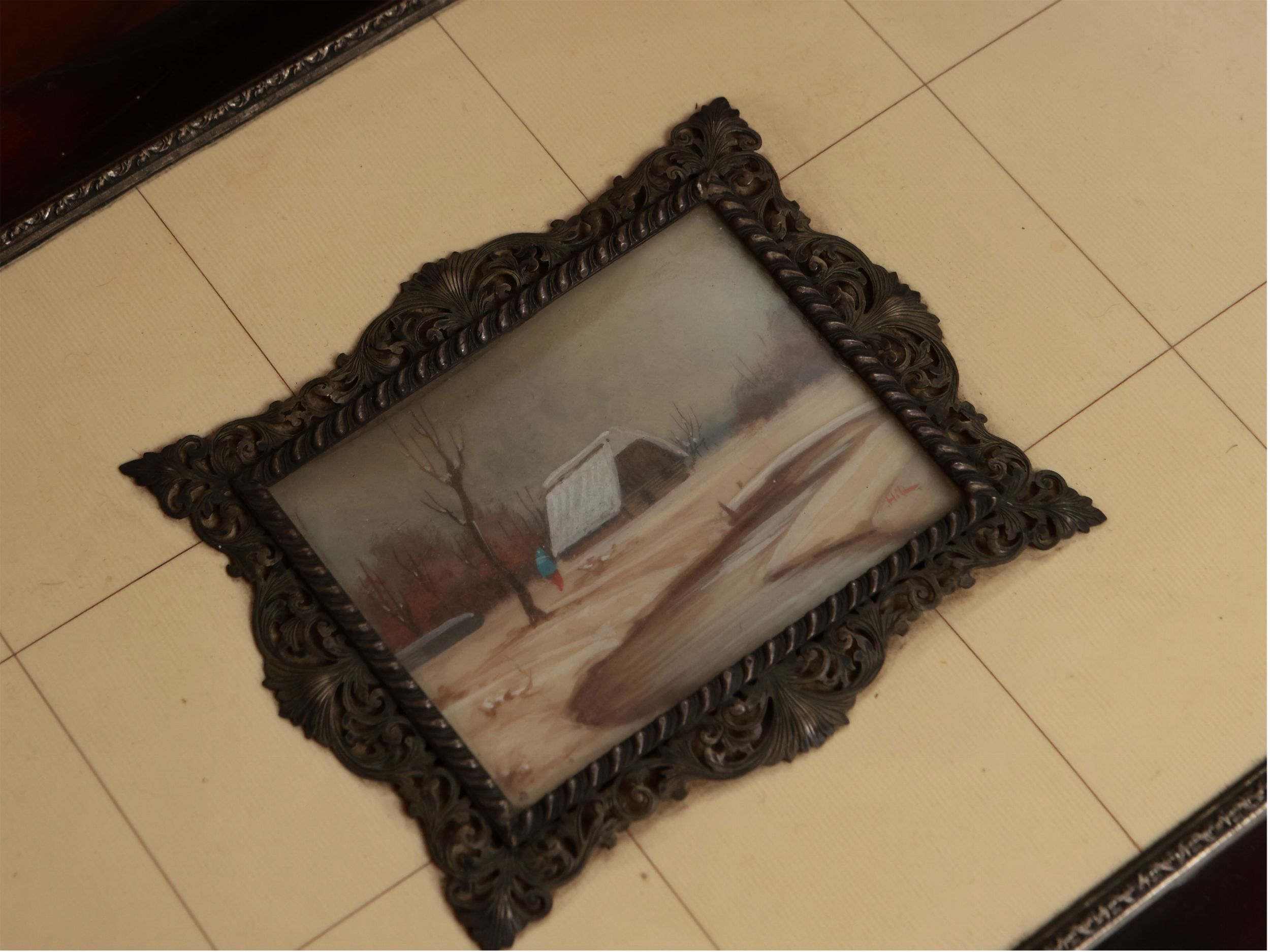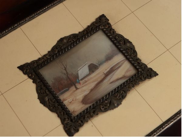 Anni Cinquanta coperchio centrato da miniatura con paesaggio invernale