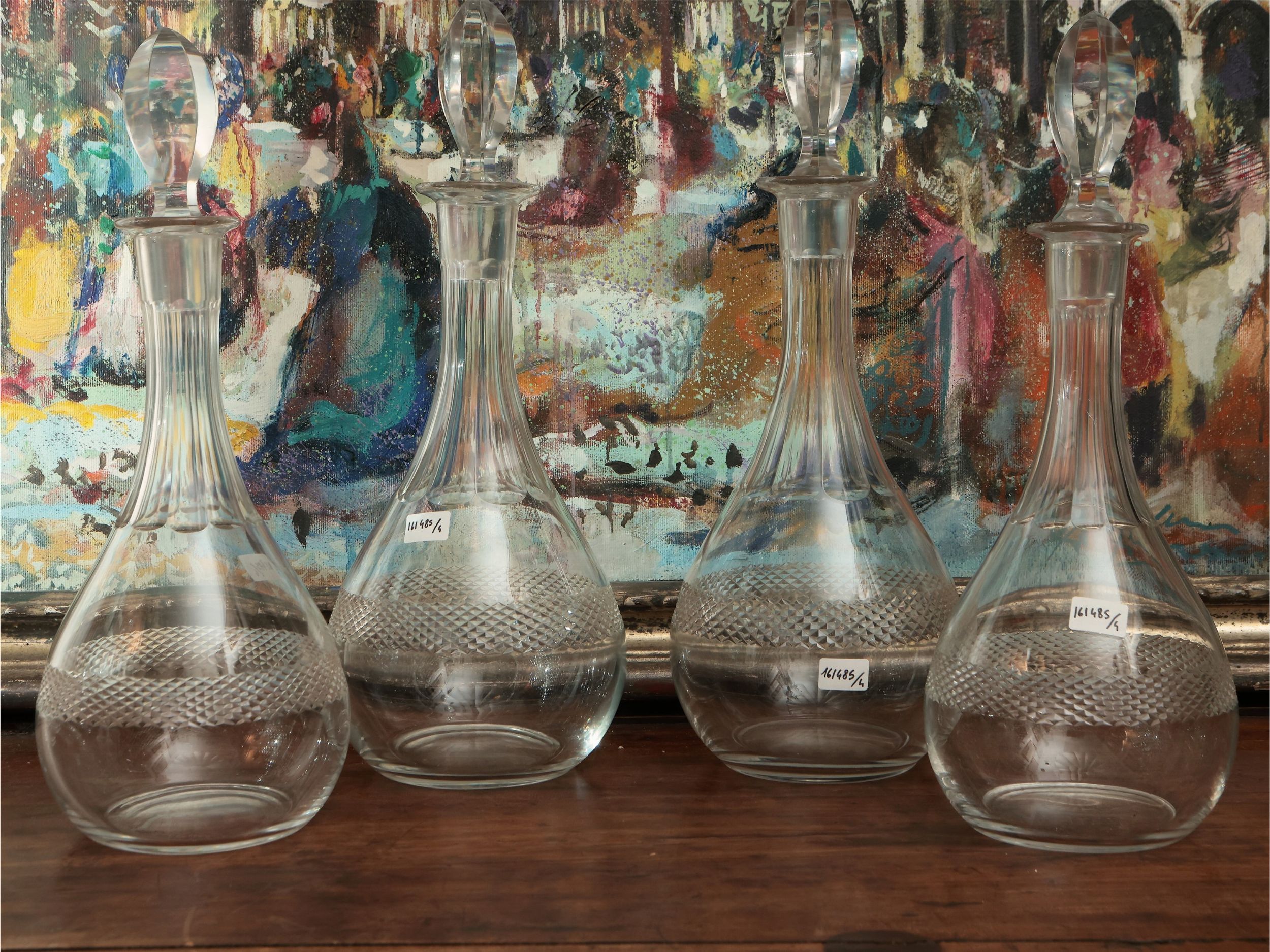 Serie di quattro bottiglie da vino in cristallo molato