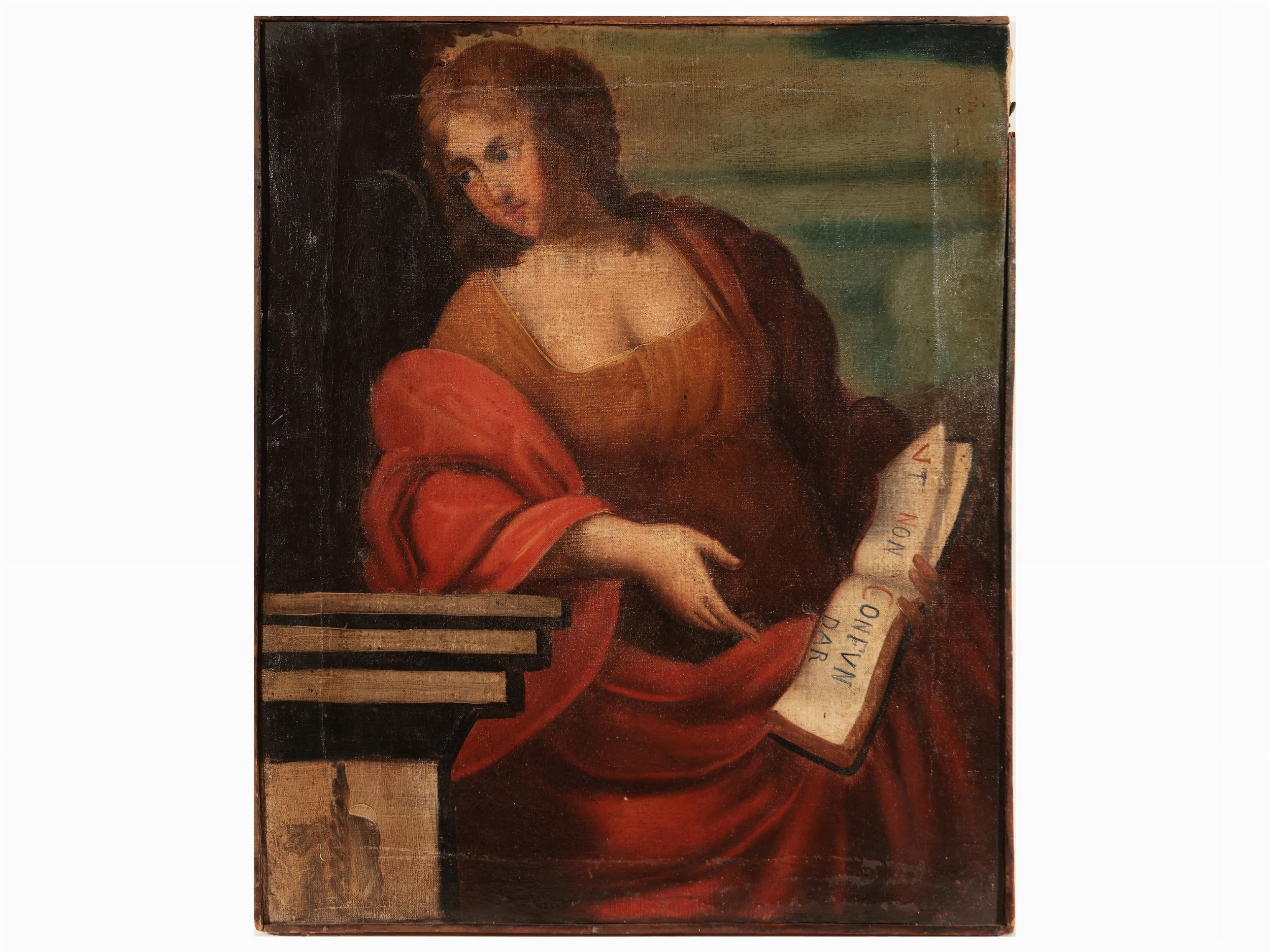 secolo XVIII/XIX olio su tela, in cornice, iscritto al retto ut non confun/dar, difetti