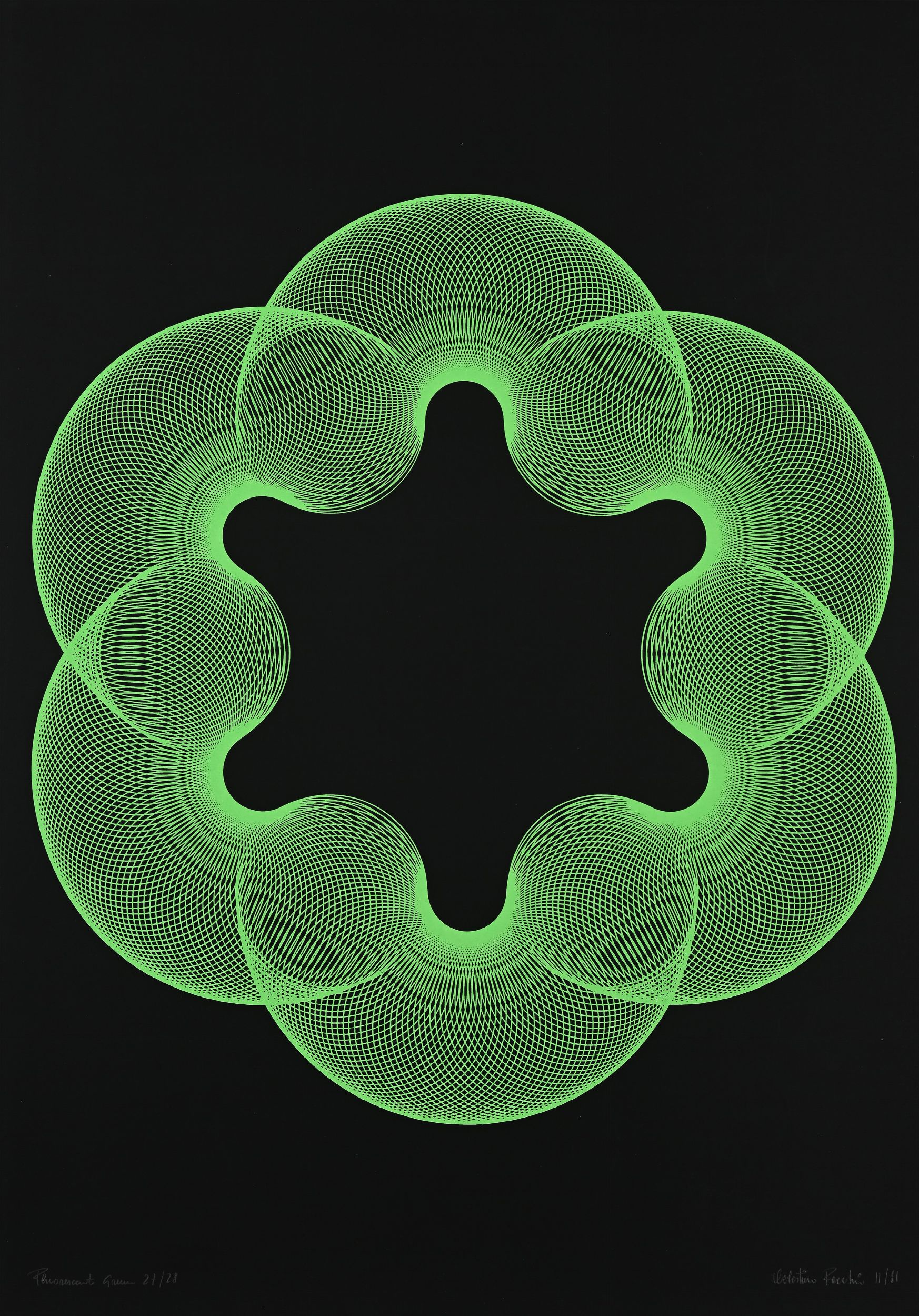 1) Antonio Sanchez, senza titolo, 1971, cm 70x50, firma, data e numerazione 70/150 2) Celestino Facchin, Fluorescent Green, 1981, cm 70x50, firma, data e numerazione 27/28 3) Celestino Facchi, Fluorescent Halit, 1981, cm 70x50, firma, data e numerazione 26/28
