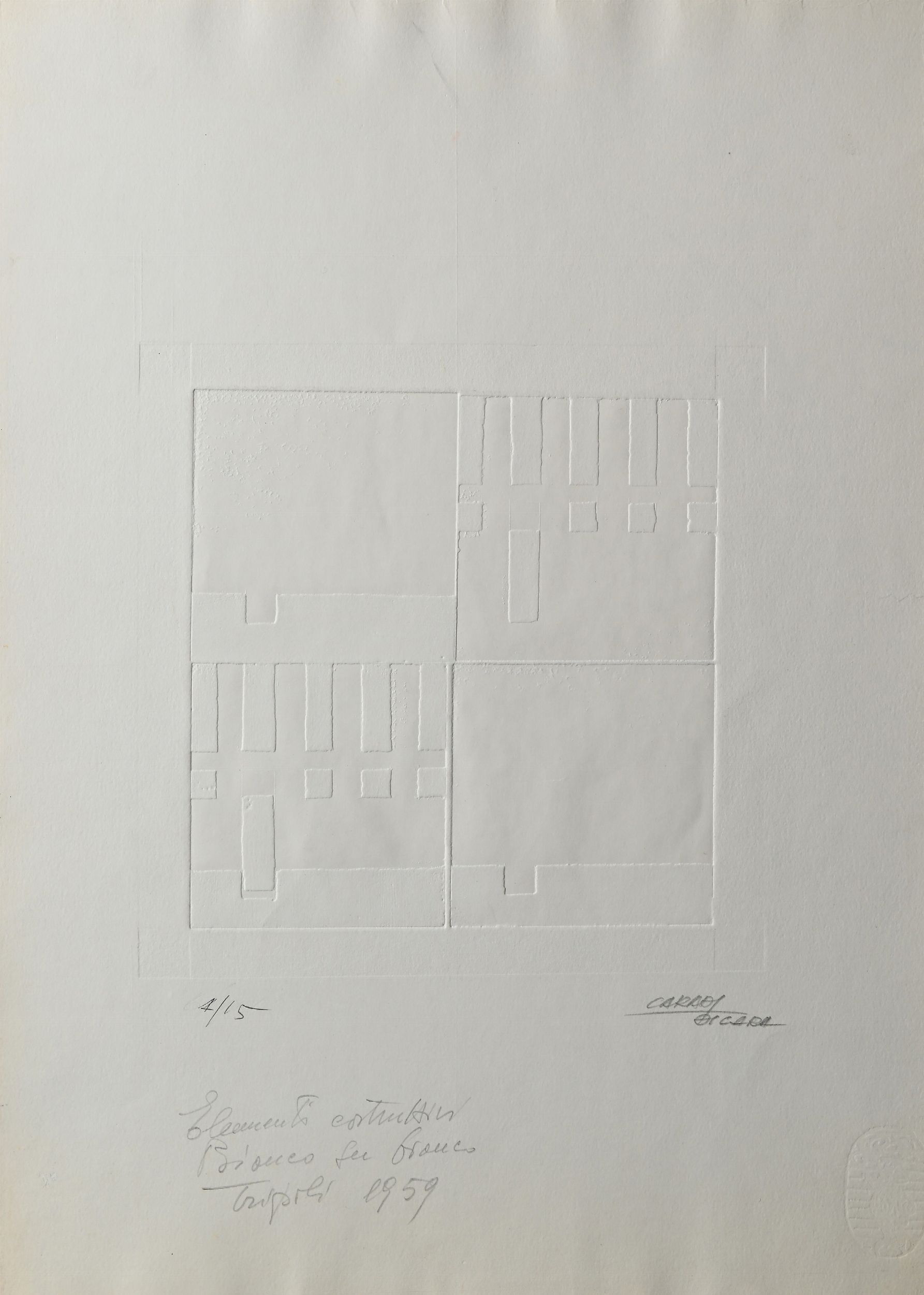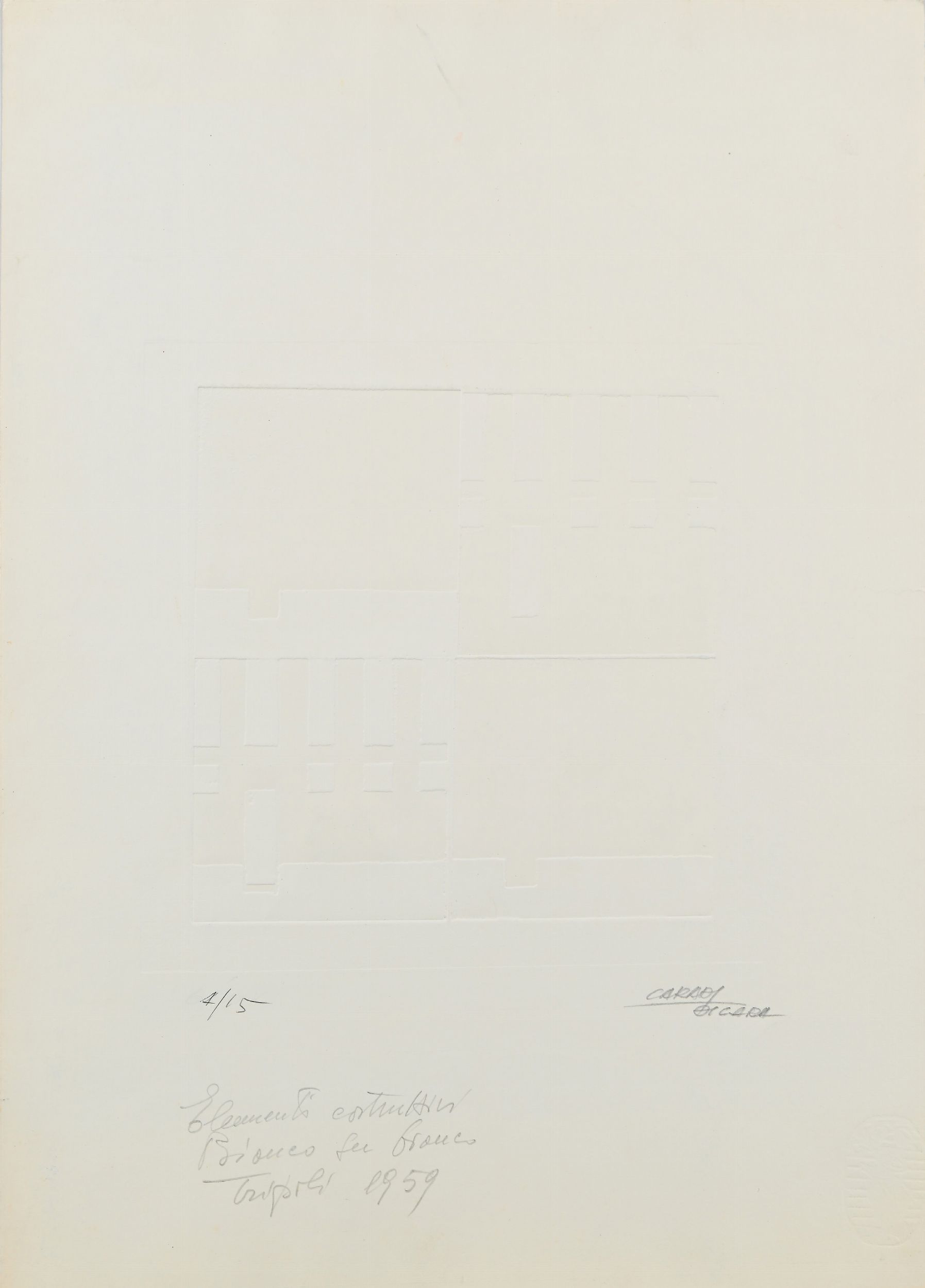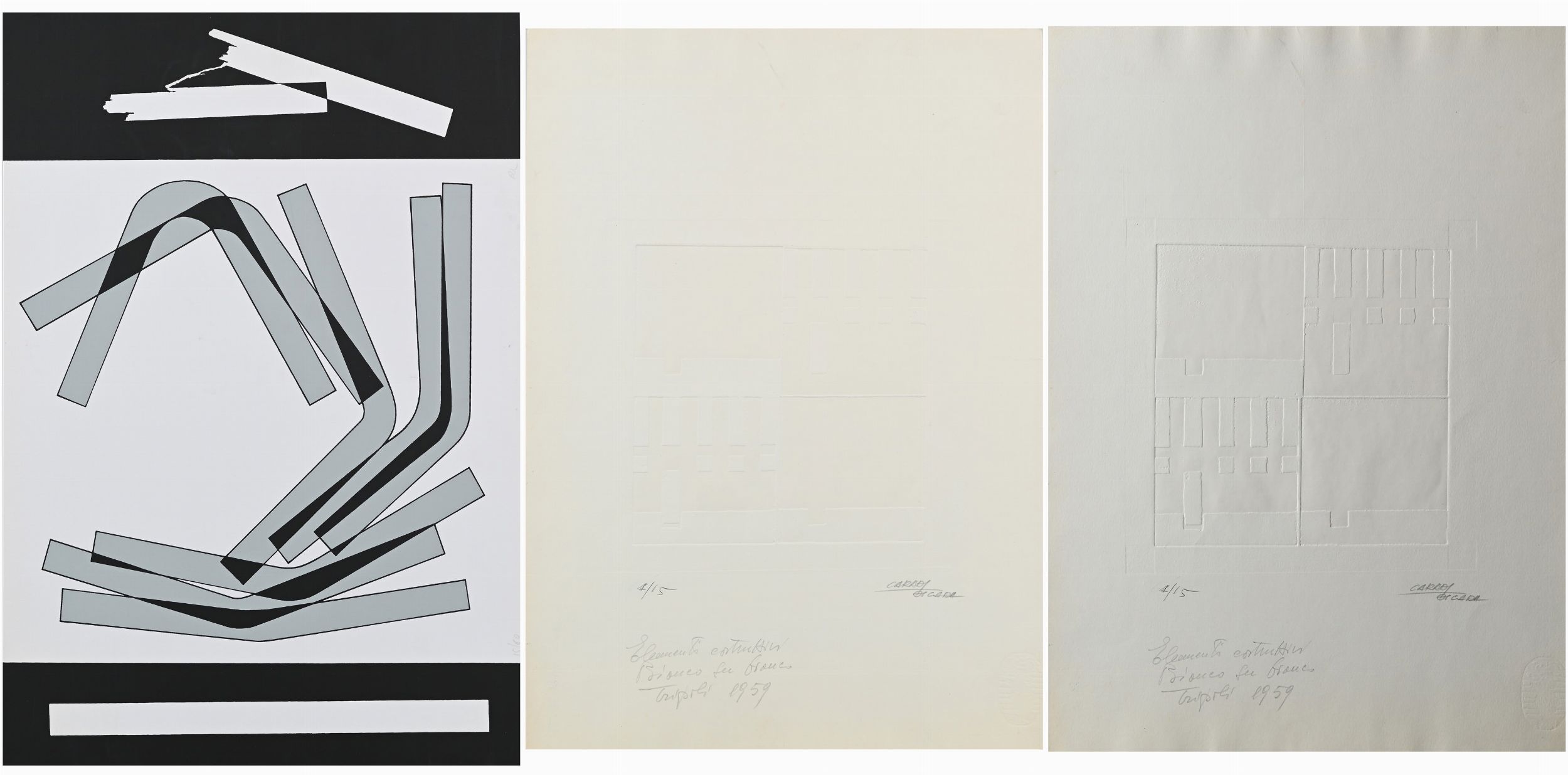 1) Anonimo (Studio Caradi Mario DI Cara) Senza titolo, 1959 calcografia cm 50x35 firma, dedica e numerazione 4/15 2) Anonimo, Senza titolo, serigrafia, monogramma, 15/60, cm 35x50