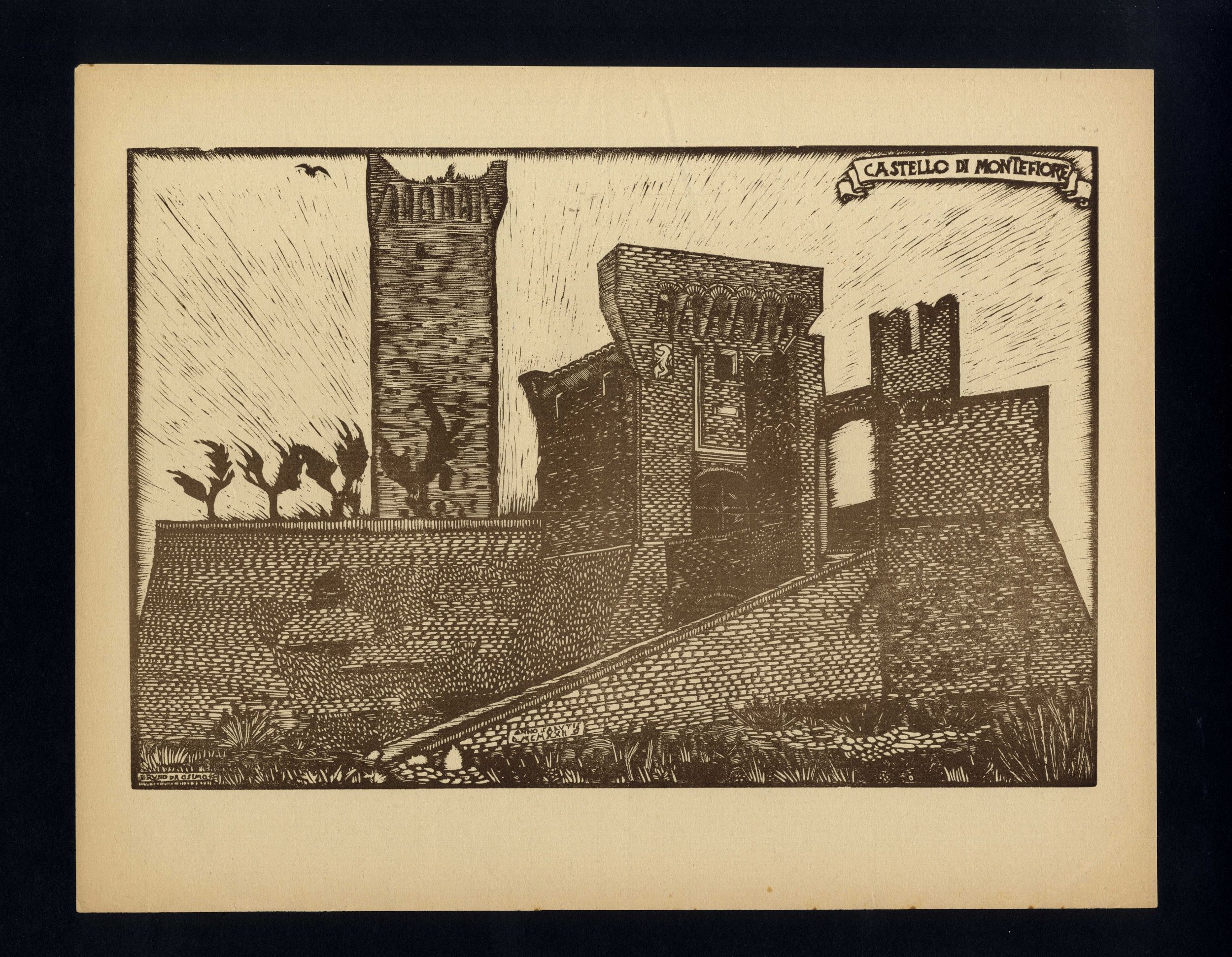 xilografia, cm 23,5x30,0. Suggestiva veduta del Castello che si trova lungo la strada che da Osimo conduce a Montefano. Bella impressione con inchiostratura molto nitida che rende al meglio i contrasti di tonalità e i chiaroscuri, tipici di questa tecnica. esemplare in ottimo stato di conservazione, come da foto