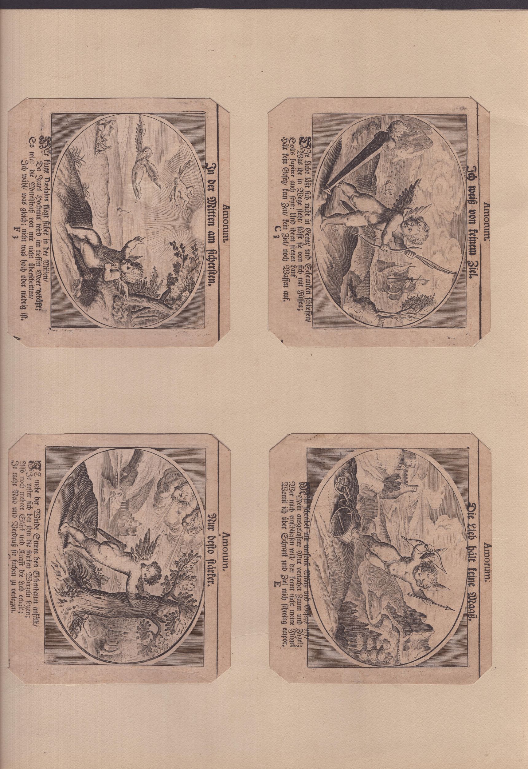 bulino, 147 x 190 mm (cad. foglio). Tratte dalla edizione tedesca di Emblemata. Con testo in italiano al verso. Belle impressioni su carta vergata con filigrane. Fogli ossidati, con dei residui cartacei al verso, per il resto in buono stato.
