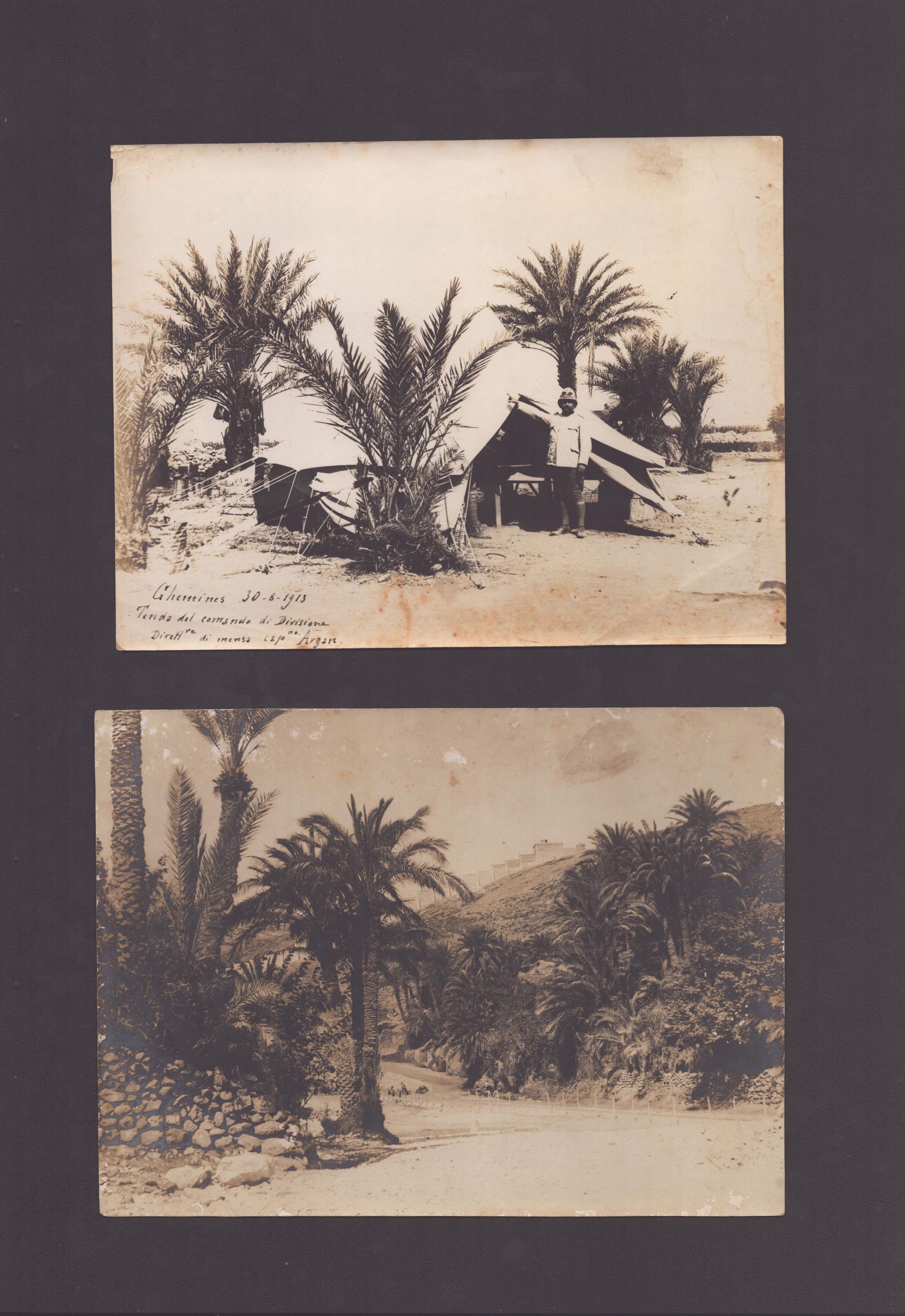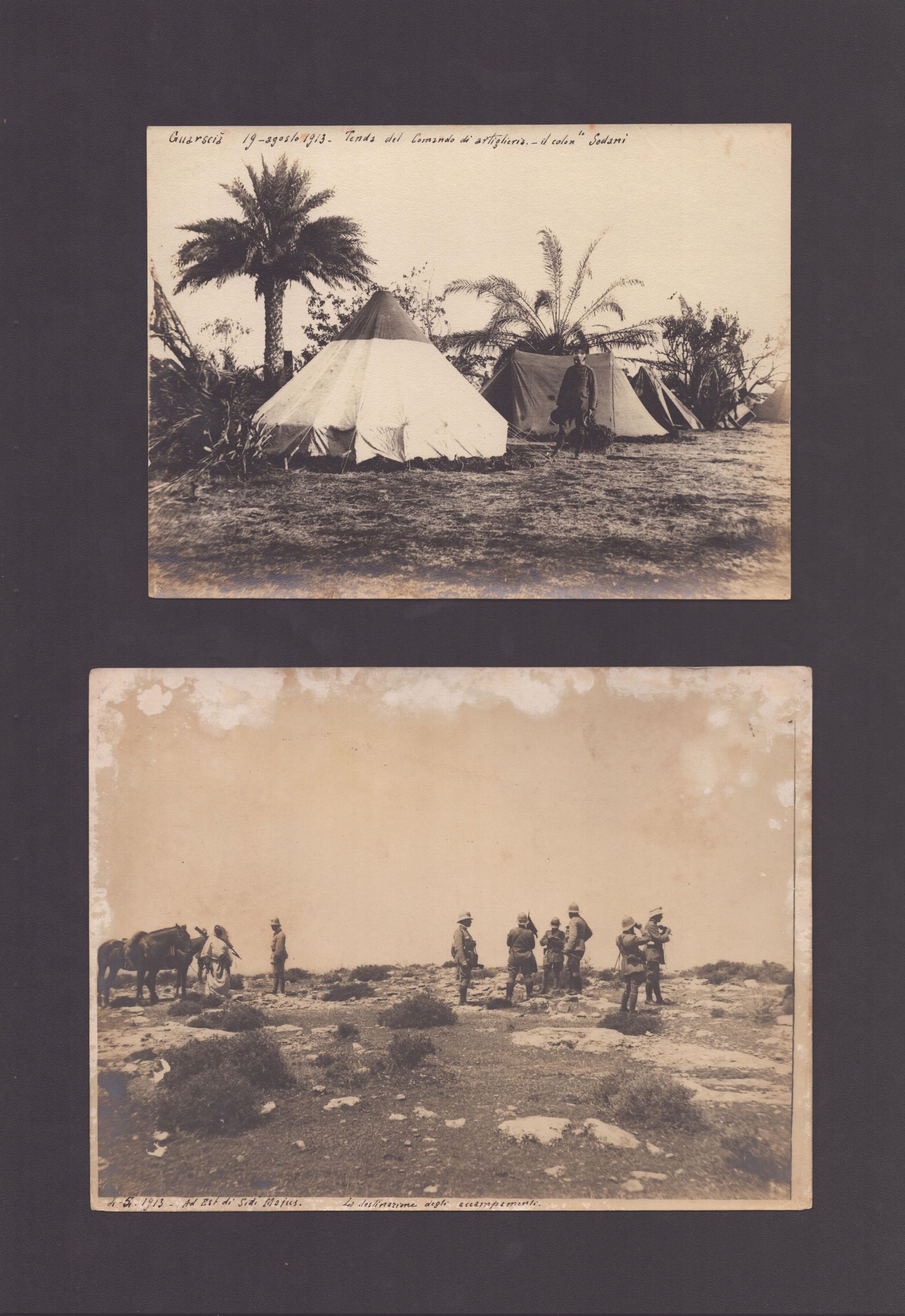 Lotto di nove stampe, 7 aristotipi (23 x 18 cm) e due albumine (12 x 8 cm) raffiguranti scene di militari e di accampamenti. Note con nomi dei personaggi e dei luoghi scritte a penna al fronte, alcune virate e con piccole perdite di emulsione ma tutte perfettamente leggibili.