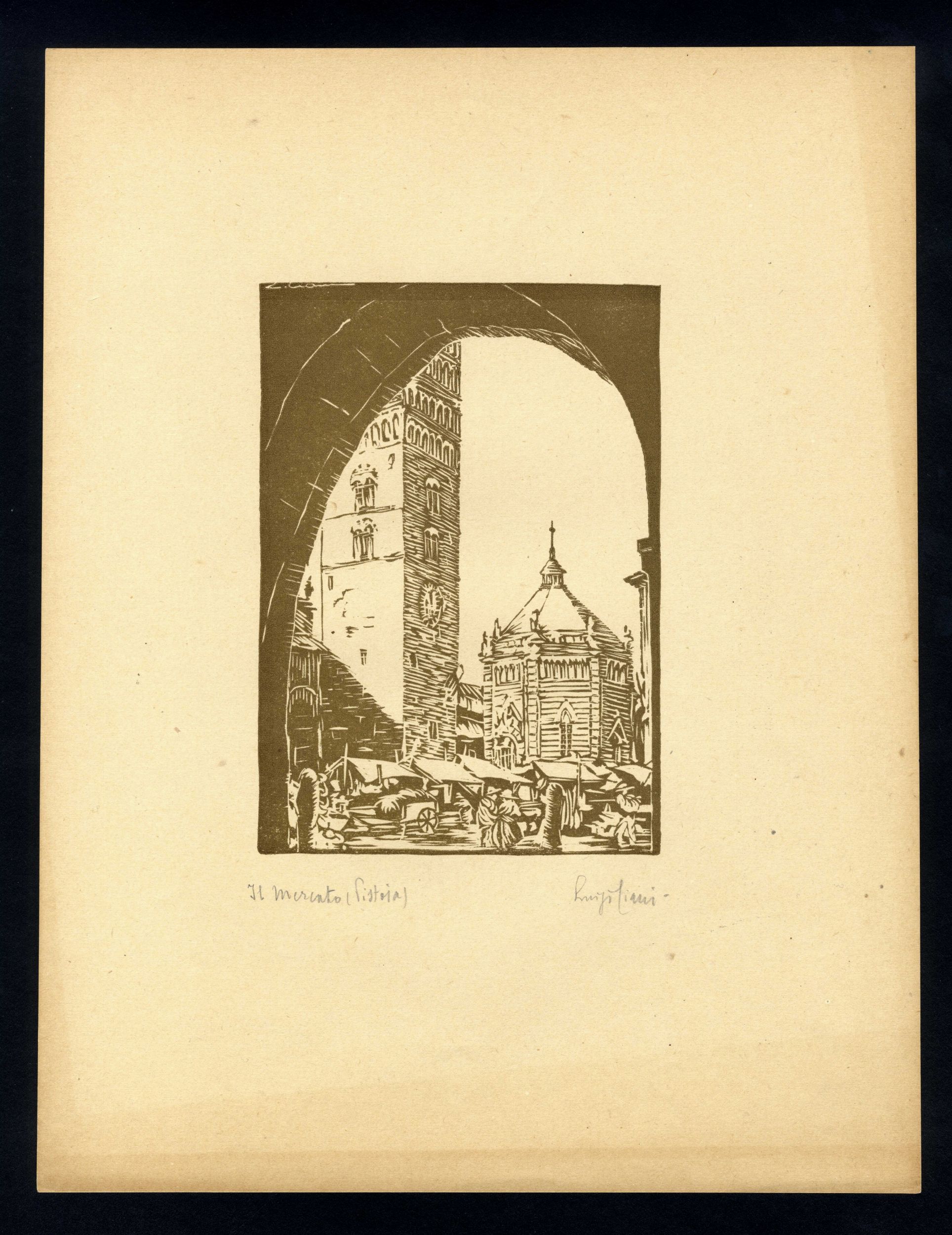 xilografia, cm 23,5X30.5. Luigi Ciani, pistoiese d'adozione fu un artista molto attivo e dedic̣ parecchia della sua produzione grafica alla rappresentazione della città e dei dintorni, attraverso piccoli scorci e vedute del paesaggio circostante; piacevole la prospettiva della piazza del Duomo dove si svolgeva il mercato, l’antica curtis regia, tra il battistero di S. Giovanni in corte e la torre del campanile di S. Zeno, resa con piccoli tratti e un particolare inchiostro color terra di siena esemplare in ottimo stato di conservazione, come da foto