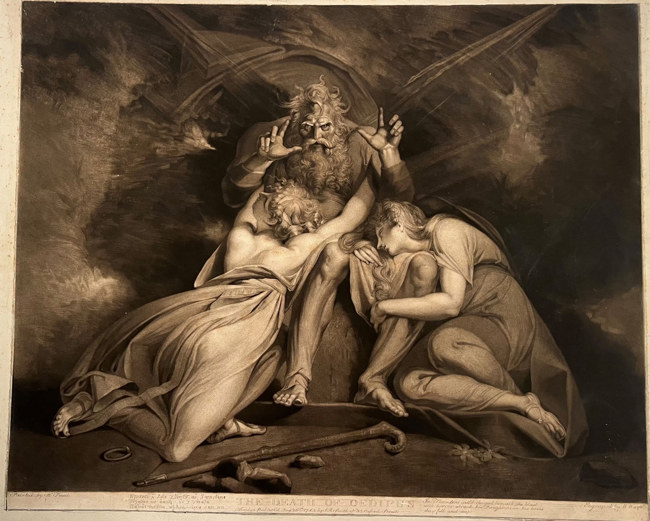 da Henry Fuseli, mezzatinta, 457 x 560 mm. Bellissima impressione in II stato, dopo l'aggiunta del titolo e i frasi in greco e inglese. Esemplare rifilato, senza margini, e intelato.