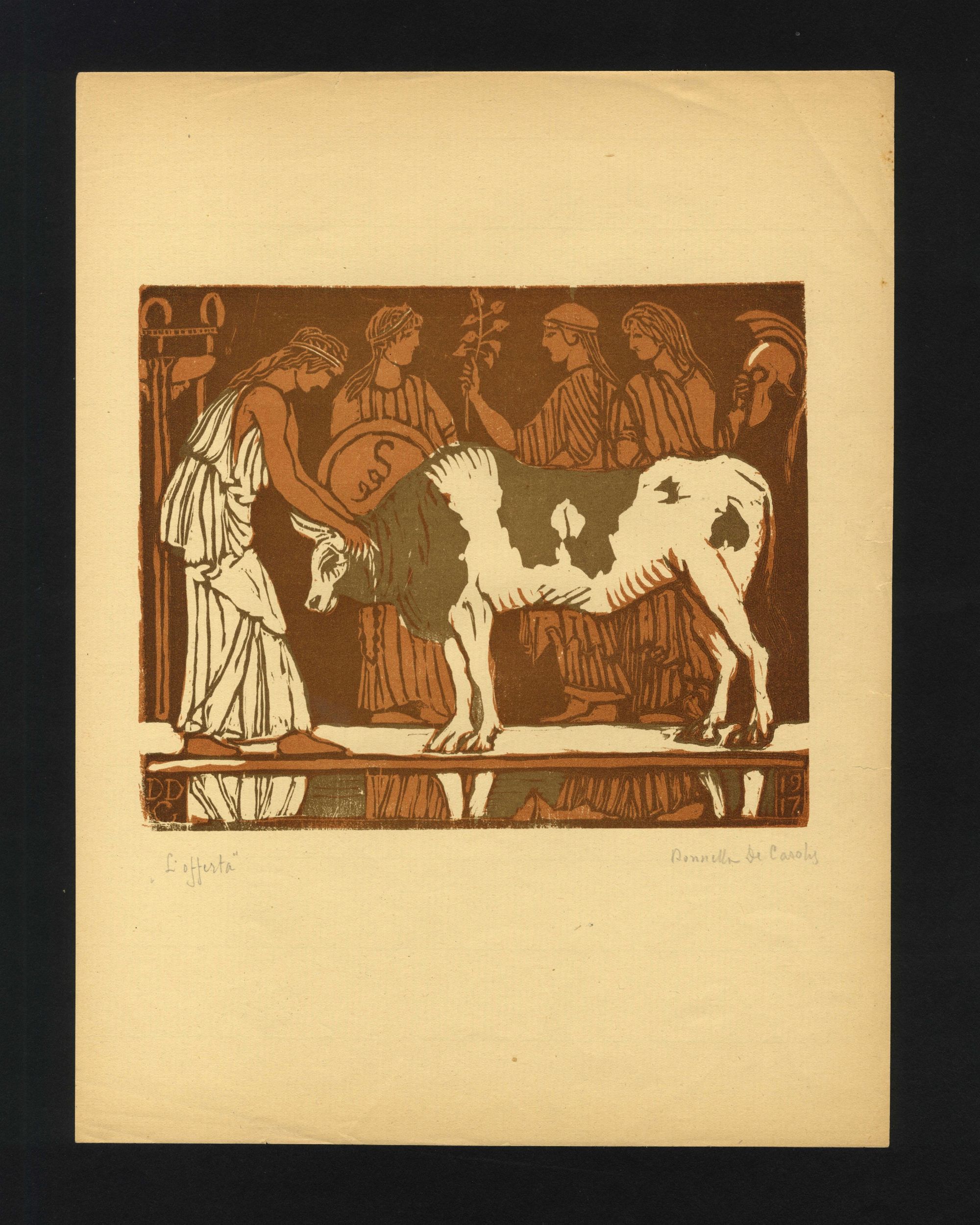 xilografia a 2 colori; cm 23,7x30,3. Scena di ispirazione ellenistica, che mostra in primo piano il grande bovino preso per le corna da una vergine, mentre sullo sfondo sacerdoti e altri personaggi formano il corteo sacro per il sacrificio agli dei. esemplare in ottimo stato di conservazione, come da foto