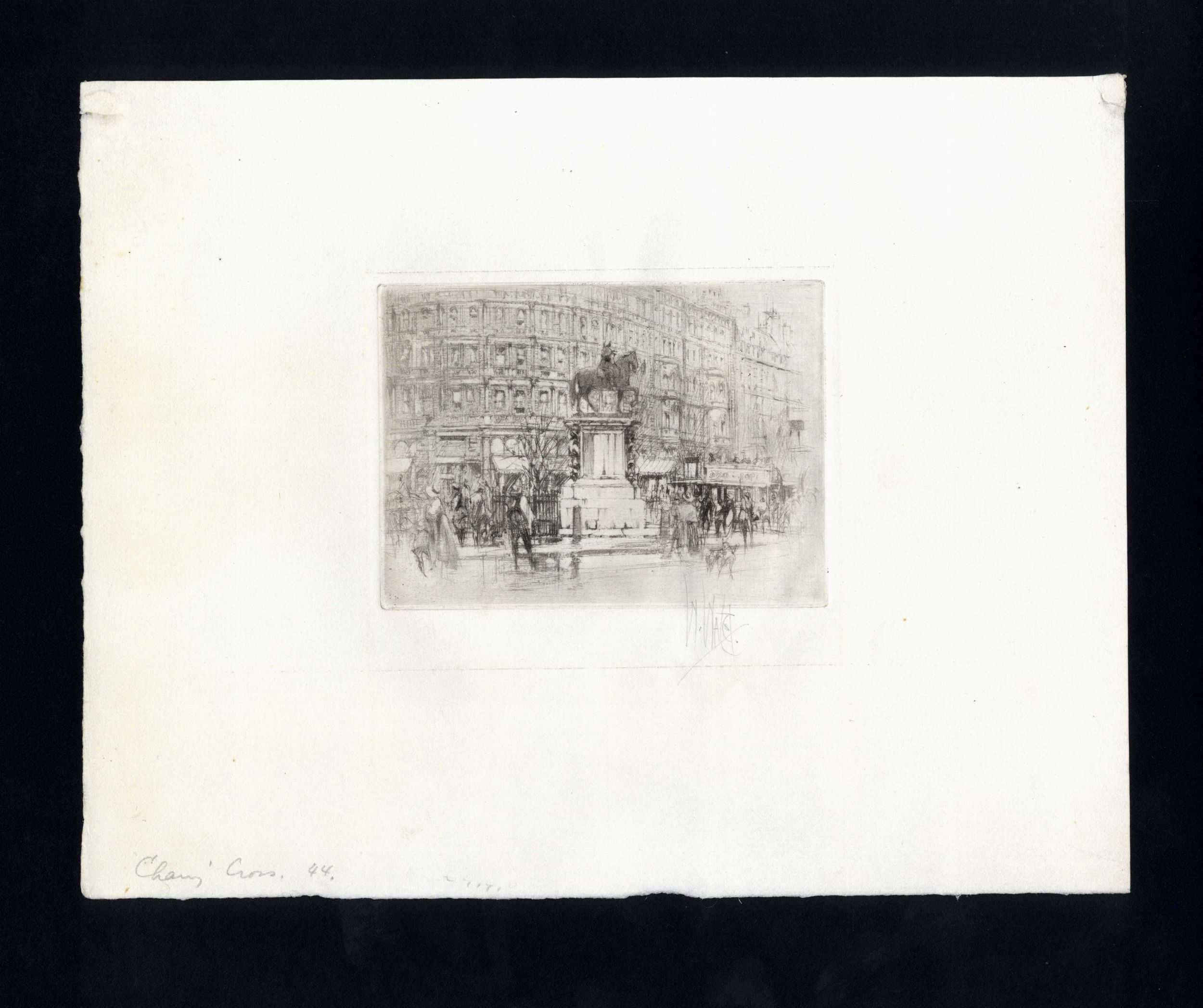 incisione a puntasecca, cm 29,3x23 . William Walcot nacque a Lustdorf, vicino Odessa, il 10 marzo 1874, figlio di un mercante viaggiatore con moglie russo-tedesca, crebbe quindi viaggiando in tutta l’Europa. Rientrato in Russia a 17 anni studiò architettura con Louis Benois all'Accademia imperiale di BBAA di San Pietroburgo (1895-97) e a Parigi all'Atelier Redon, nell'Ecole des Beaux-Arts. Per un breve periodo esercitò la professione di architetto a Mosca, progettando per esempio l'Hotel Metropole nel 1898. Nel 1907 si stabilì a Londra dove si dedicò principalmente al disegno di architetture, progettando nel 1933 un edificio al 61 di St. James Street, e successivamente acquisendo una grande tecnica nelle incisioni, soprattutto a puntasecca. Per tutti gli anni '20 e '30, Walcot divenne il disegnatore di architettura più famoso d'Inghilterra, esaltando le prospettive degli edifici che ritraeva con grande padronanza di tecniche varie come anche l'acquerello e la gouache. Le sue vedute cittadine sono uno scorcio unico sulle grandi città dell’inizio del Novecento, dei piccoli capolavori di accuratezza nella resa generale della veduta, che si forma con i mille incroci dei tratti incisori, e sfuma verso lo sfondo della veduta, dove il disegno di dissolve. Tutte le vedute sono firmate a matita in basso dall’autore. Charing Cross è un'importante intersezione stradale di Londra, Da tempo è convenzionalmente considerata il centro della città: si trova all'incrocio tra Strand, Whitehall e Cockspur Street. Il nome deriva dalla croce di Eleonora che il Re Edoardo I vi pose in memoria della moglie Eleonora di Castiglia; dal 1675, il sito della croce è occupato dalla statua di King Charles I a cavallo. esemplare in perfette condizioni, stampato su carta color avorio, foglio completo con grandi margini; minimi difetti agli angoli superiori, al verso; firma autografa a matita in basso a destra