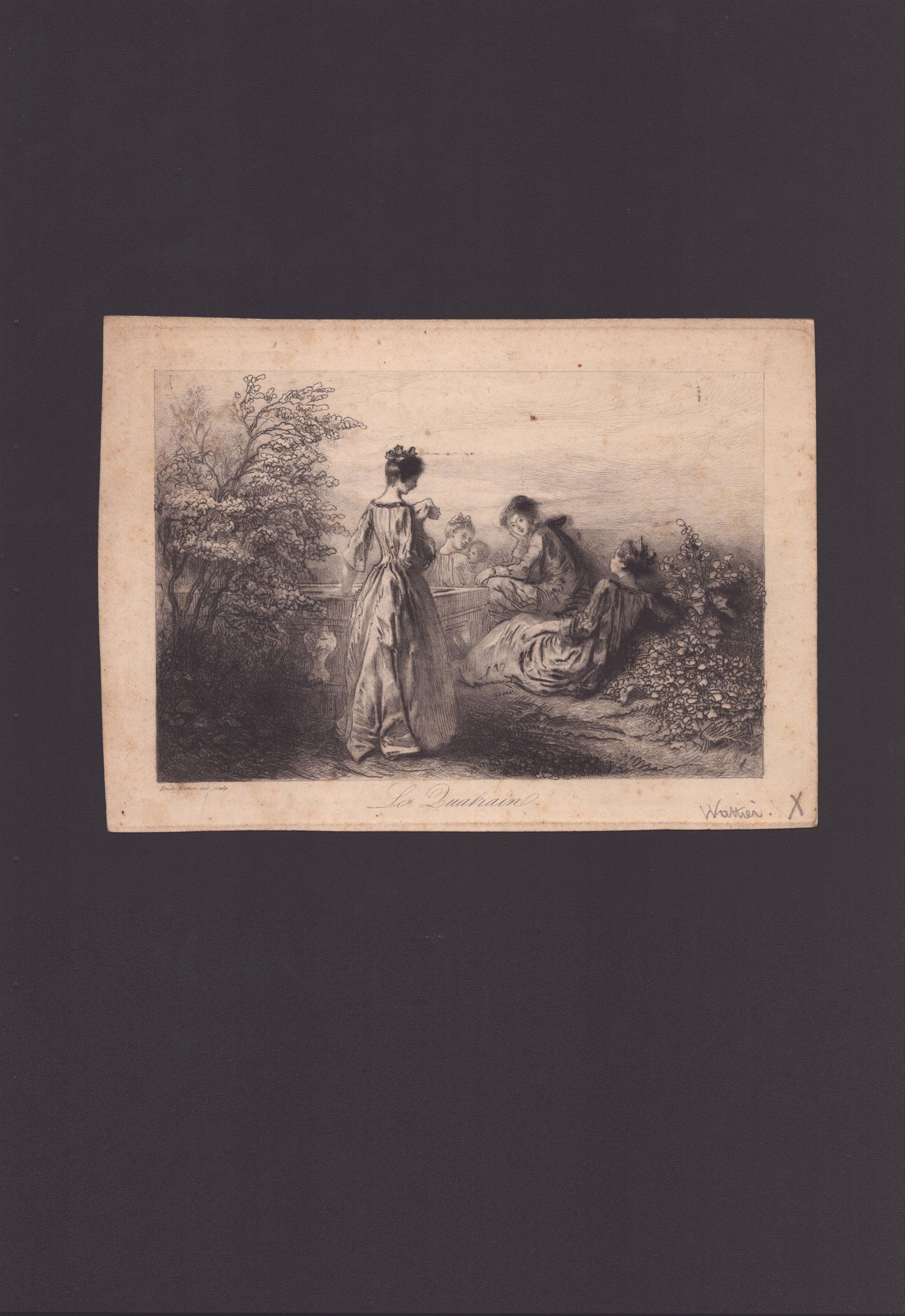 1) Jean Le Pautre. INCENDIO DI TROIA. Copia in controparte da LePautre. Bulino, acquaforte, 152 x 207 mm. Fresca impressione. Esemplare controfondato, con macchie e fioriture. 2) Francesco del Pedro da Pietro Antonio Novelli. IL GOVERNO DE' TRIBUNI NELL'ISOLE VENETE. Bulino e acquaforte, 296 x 292 mm. Bella impressione su carta vergata. Sgualciature, traccia di piega verticale, alcuni strappi restaurati al verso. Per il resto in buono stato. 3) Jean Baptiste Racine da Bartholomeus Breenbergh. LA TOUR. Dalla serie Galerie du Palais Royal. Bulino e acquaforte, 414 x 287 mm (foglio). Bella impressione su carta vergata. Foglio con bruniture e fioriture, ma in buono stato generale. 4) Emile Wattier da Watteau. LE QUATRAIN. Acquaforte e puntasecca, 167 x 235 mm (foglio). Buone condizioni generali. 5) Filippo Palizzi. Mercante. Litografia, 225 x 150 mm. Buone condizioni, applicato in due punti su un supporto.