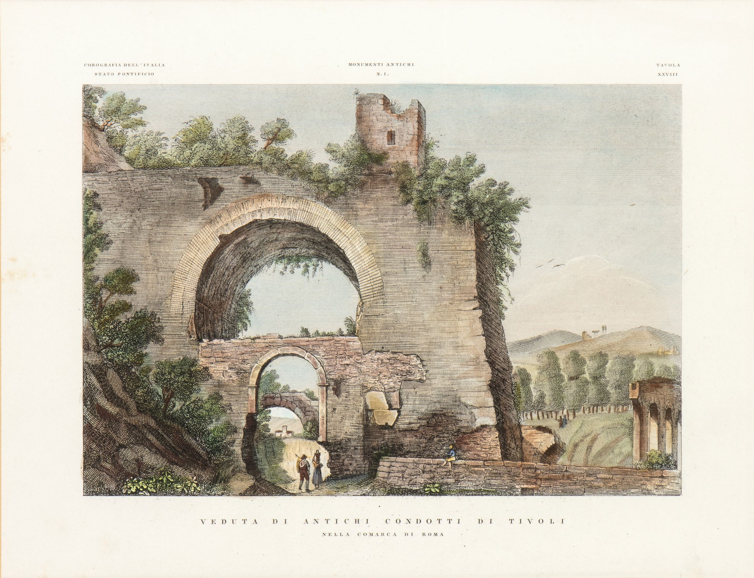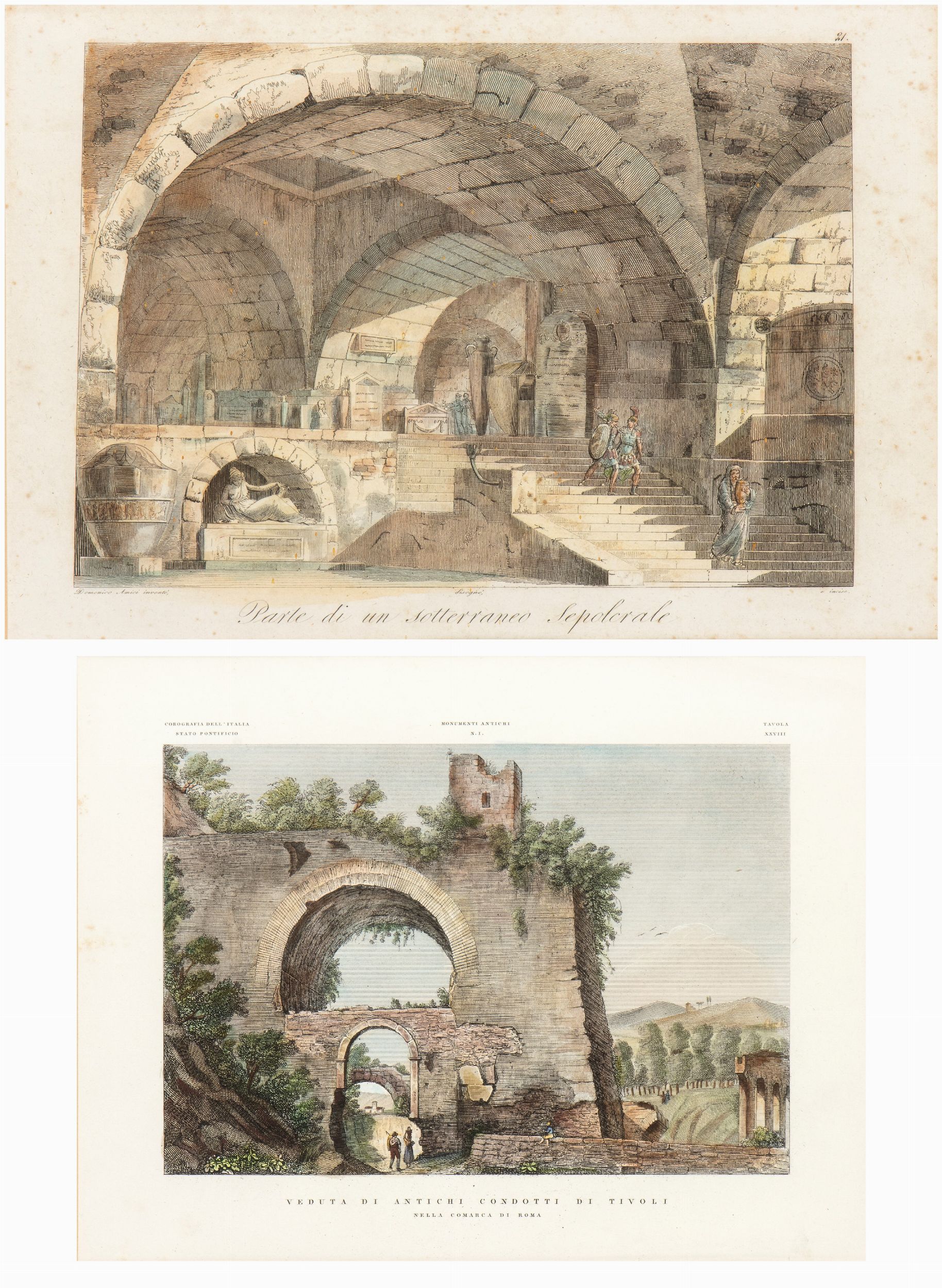 A) Domenico Amici (1808-1877 ca), Parte di un sotterraneo sepolcrale, acquaforte, 25 x 36 cm, colorata a mano, segni di fioritura B) Veduta di Antichi condotti di Tivoli..., bulino, 29 x 37 cm. Entrambi con passe-partout, cornice e vetro (46 x 57 x 2 cm ca.)
