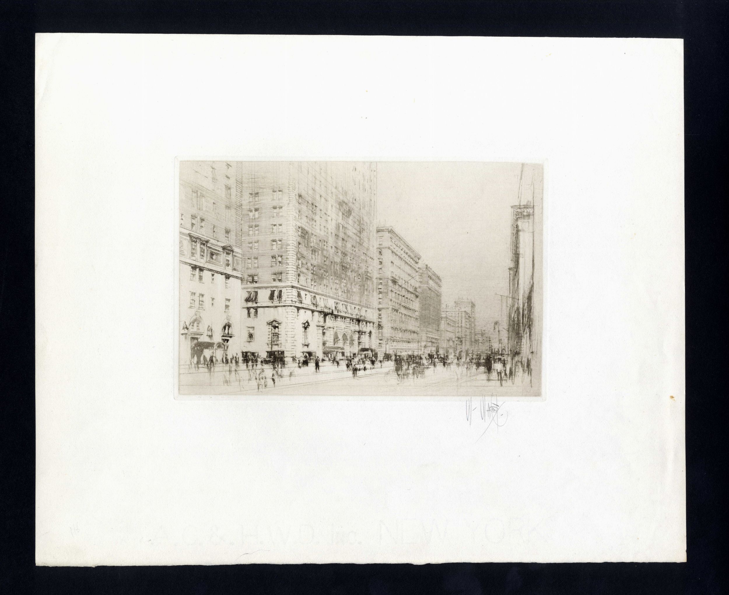 incisione a puntasecca, cm 32x 26,5 . William Walcot nacque a Lustdorf, vicino Odessa, il 10 marzo 1874, figlio di un mercante viaggiatore con moglie russo-tedesca, crebbe quindi viaggiando in tutta l’Europa. Rientrato in Russia a 17 anni studiò architettura con Louis Benois all'Accademia imperiale di BBAA di San Pietroburgo (1895-97) e a Parigi all'Atelier Redon, nell'Ecole des Beaux-Arts. Per un breve periodo esercitò la professione di architetto a Mosca, progettando per esempio l'Hotel Metropole nel 1898. Nel 1907 si stabilì a Londra dove si dedicò principalmente al disegno di architetture, progettando nel 1933 un edificio al 61 di St. James Street, e successivamente acquisendo una grande tecnica nelle incisioni, soprattutto a puntasecca. Per tutti gli anni '20 e '30, Walcot divenne il disegnatore di architettura più famoso d'Inghilterra, esaltando le prospettive degli edifici che ritraeva con grande padronanza di tecniche varie come anche l'acquerello e la gouache. Le sue vedute cittadine sono uno scorcio unico sulle grandi città dell’inizio del Novecento, dei piccoli capolavori di accuratezza nella resa generale della veduta, che si forma con i mille incroci dei tratti incisori, e sfuma verso lo sfondo della veduta, dove il disegno di dissolve. Tutte le vedute sono firmate a matita in basso dall’autore. esemplare in perfette condizioni, stampato su carta color avorio, foglio completo con grandi margini, con filigrana di Dickins