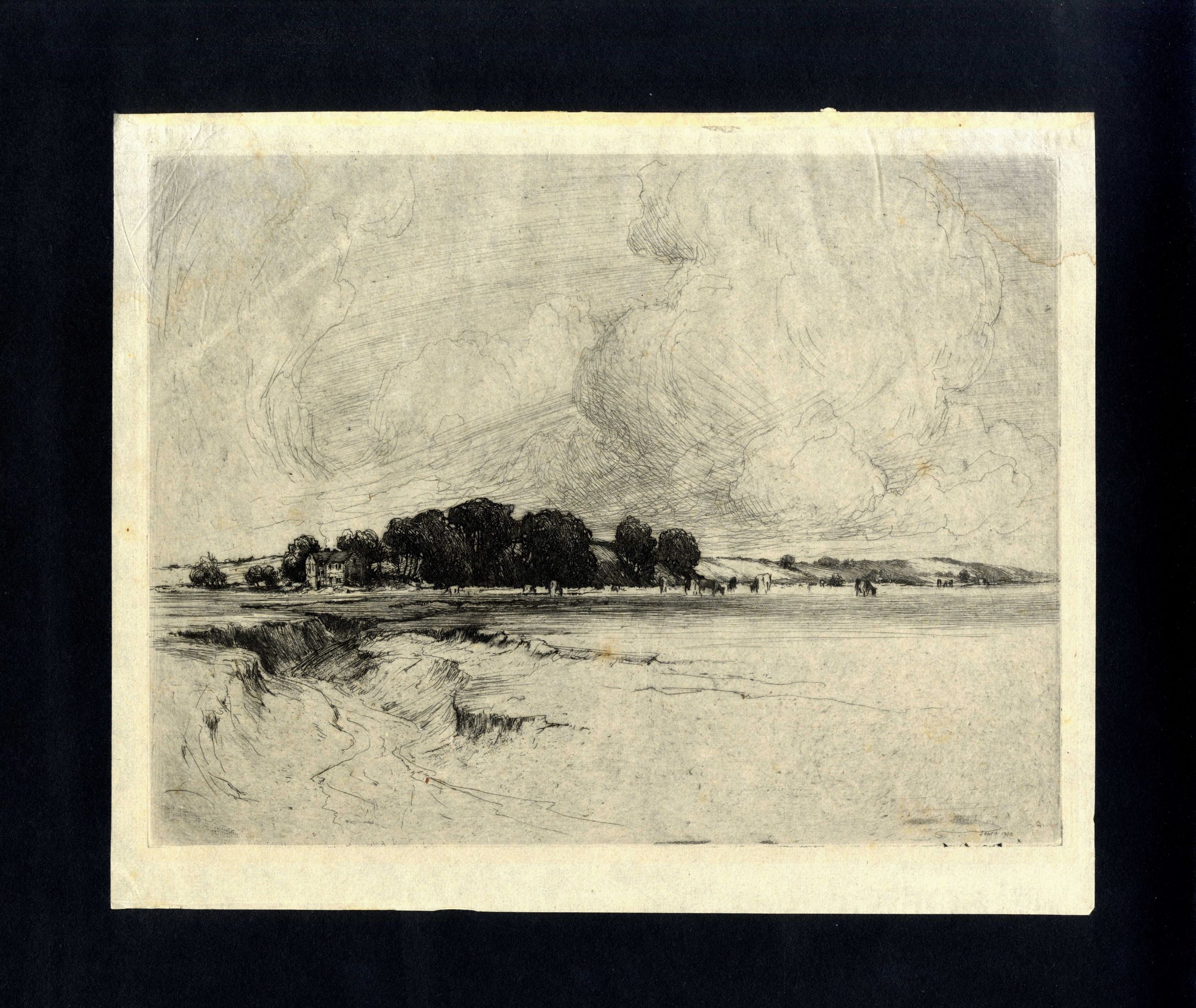 acquaforte stampa su carta china cm 27x22; data in basso a detsra. Incisore inglese, Frank Burridge fu un illustre allievo di Frank Short, e divenne poi preside della Liverpool City School of Art, e nel 1912 preside della Central School of Arts and Crafts. Fu membro della Royal Society of Painter-Etchers, noto tra i suoi contemporanei, non è comune sul mercato Bellisima incisione, resa ancora più particolare dall'uso della leggerissima carta china per la stampa, che esalta le aree scure in contrasto con le zone chiare del paesaggio; foglio integro e completo, pefetto stato di conservazione, considerando anche la delicatezza della carta ( NB maneggiare cun cura )