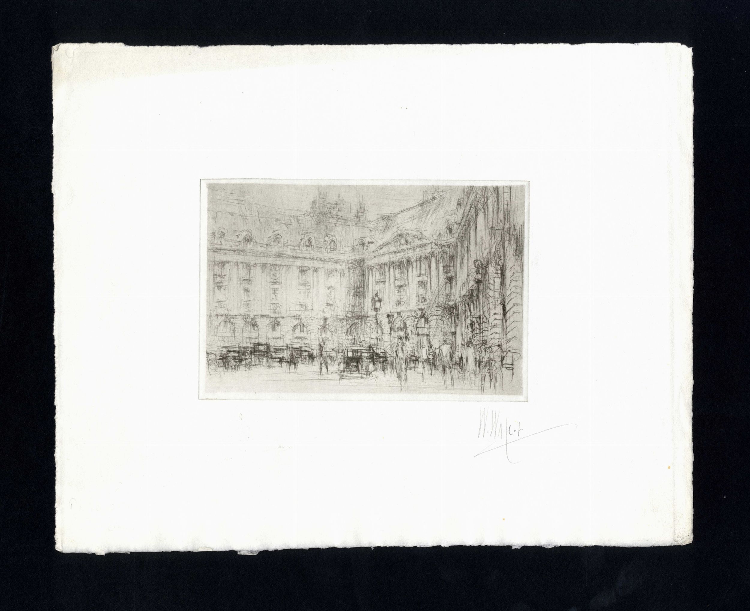 incisione a puntasecca, cm 28,2x22,5. William Walcot nacque a Lustdorf, vicino Odessa, il 10 marzo 1874, figlio di un mercante viaggiatore con moglie russo-tedesca, crebbe quindi viaggiando in tutta l’Europa. Rientrato in Russia a 17 anni studiò architettura con Louis Benois all'Accademia imperiale di BBAA di San Pietroburgo (1895-97) e a Parigi all'Atelier Redon, nell'Ecole des Beaux-Arts. Per un breve periodo esercitò la professione di architetto a Mosca, progettando per esempio l'Hotel Metropole nel 1898. Nel 1907 si stabilì a Londra dove si dedicò principalmente al disegno di architetture, progettando nel 1933 un edificio al 61 di St. James Street, e successivamente acquisendo una grande tecnica nelle incisioni, soprattutto a puntasecca. Per tutti gli anni '20 e '30, Walcot divenne il disegnatore di architettura più famoso d'Inghilterra, esaltando le prospettive degli edifici che ritraeva con grande padronanza di tecniche varie come anche l'acquerello e la gouache. Le sue vedute cittadine sono uno scorcio unico sulle grandi città dell’inizio del Novecento, dei piccoli capolavori di accuratezza nella resa generale della veduta, che si forma con i mille incroci dei tratti incisori, e sfuma verso lo sfondo della veduta, dove il disegno di dissolve. Tutte le vedute sono firmate a matita in basso dall’autore. esemplare in perfette condizioni, stampato su carta color avorio, foglio completo con grandi margini; firma autografa a matita in basso a destra