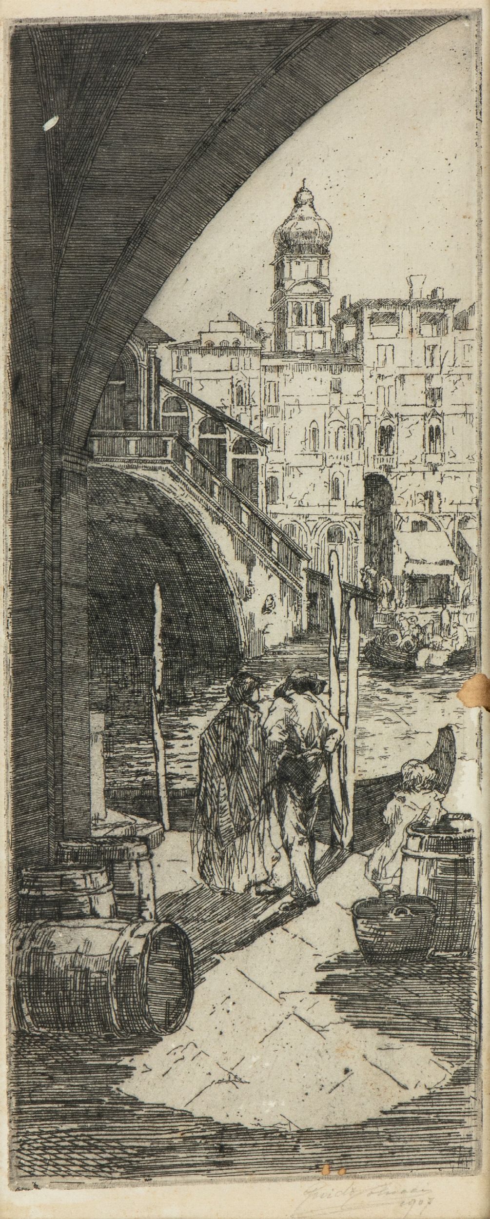 1907 Acquaforte, 293 x 118 mm (lastra), 313 x 131 mm (foglio). Firmato e datato in basso a matita. Fresca e nitida impressione con plate tone su carta non vergata. Condizioni generali buono salvo due piccole mancanze a destra, di cui una restaurata, e due piccoli fori in basso, sopra la firma del artista.