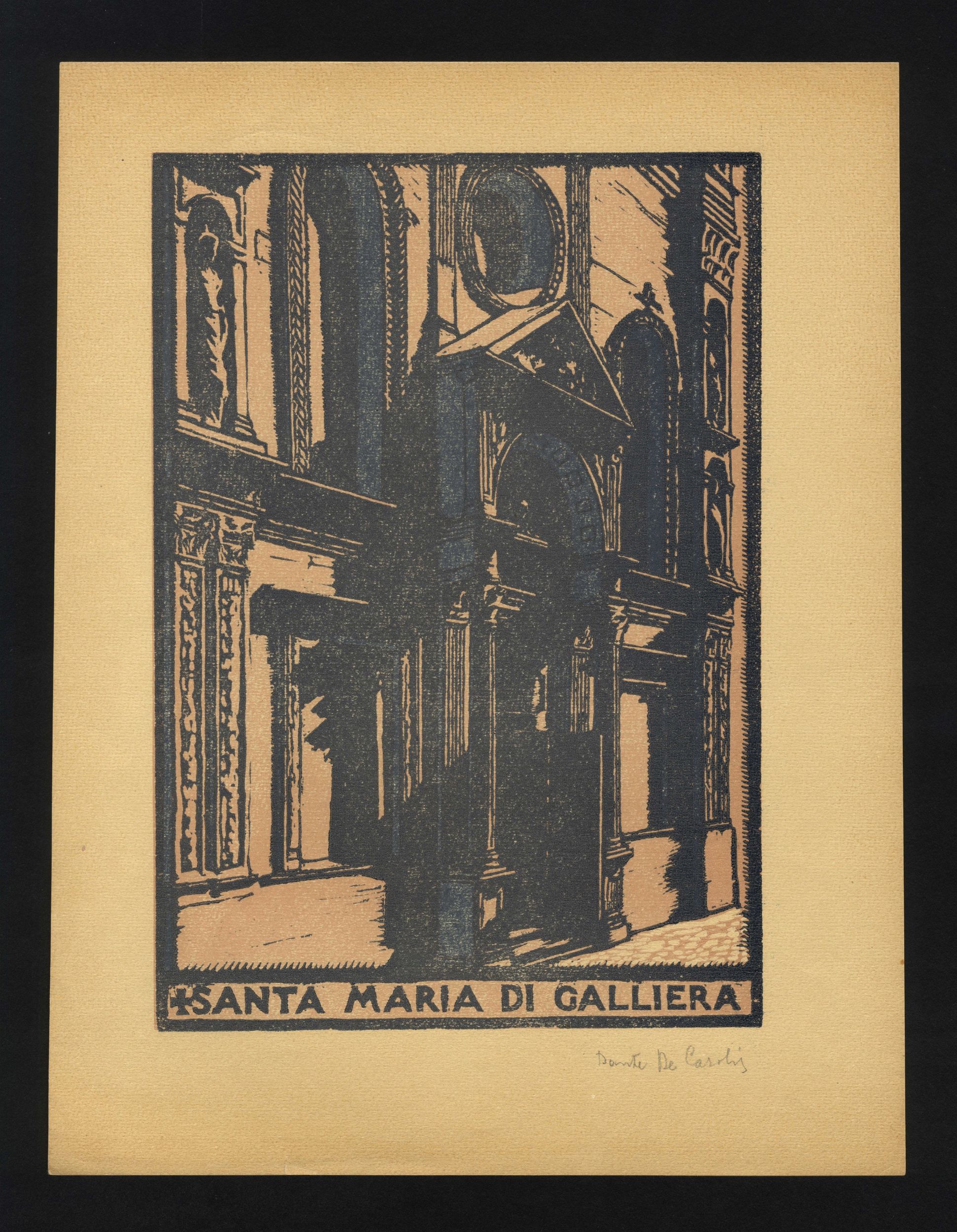 xilografia a 2 colori; cm 23,6x30,2. Bella ed inetnsa veduta della facciata rinascimentale della Chiesa bolognese, con le statue marmoree nelle nicchie; il tono scuro della xilo rende ancora più scultoreo tutto l'insieme esemplare in perfetto stato di conservazione, come da foto