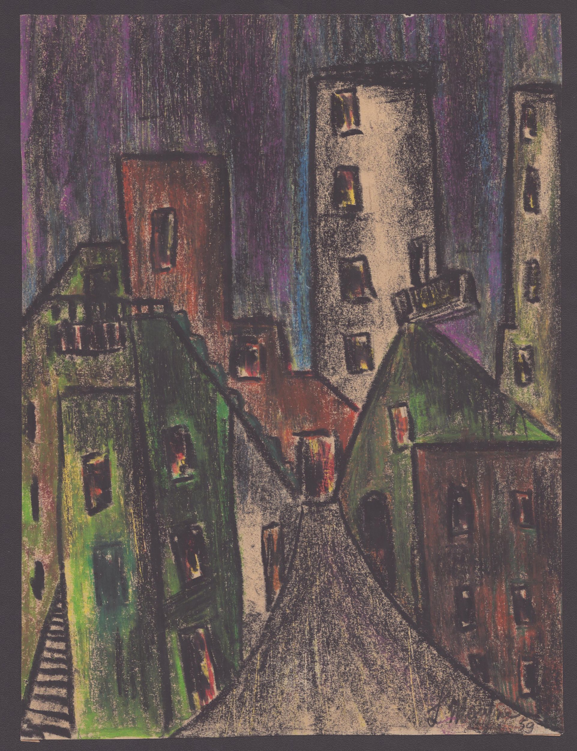 1959 Pastello e carboncino su carta, 275 x 208 mm. Firma indecifrabile e data in basso a destra. Al verso disegno di una planimetria.