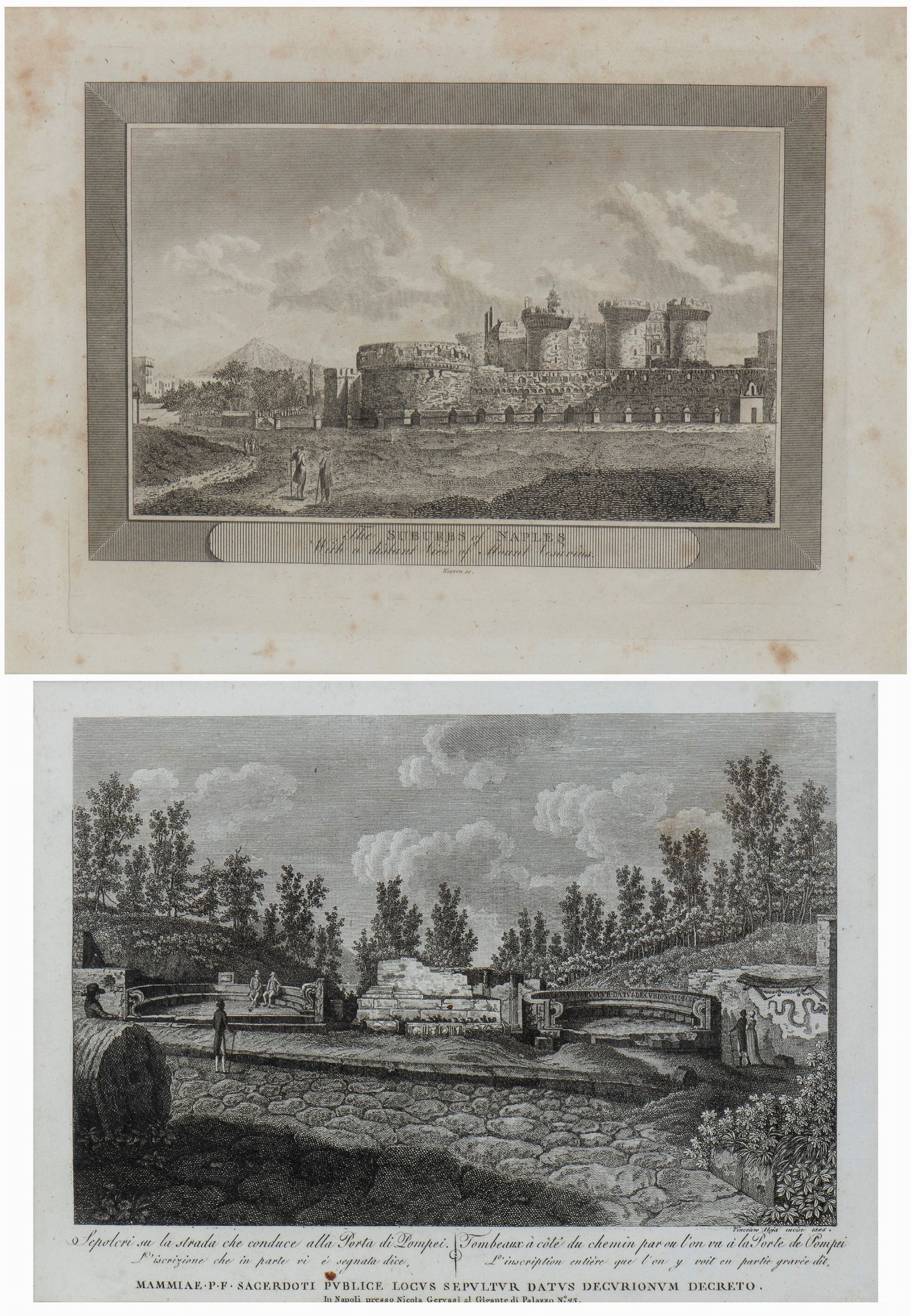 Lotto di 2 incisioni: 1) The Suburbs of Naples, circa 1790. Bulino, circa 210 x 260 mm. Buone condizioni generali con leggeri segni di fioritura. Con passe-partout e cornice (35 x 44 x 2 cm). 2) Sepolcri su la strada che conduce alla Porta di Pompei. Acquaforte, circa 230 x 310 mm. Condizioni molto buone. Con passe-partout e cornice (36 x 45 x 2 cm).