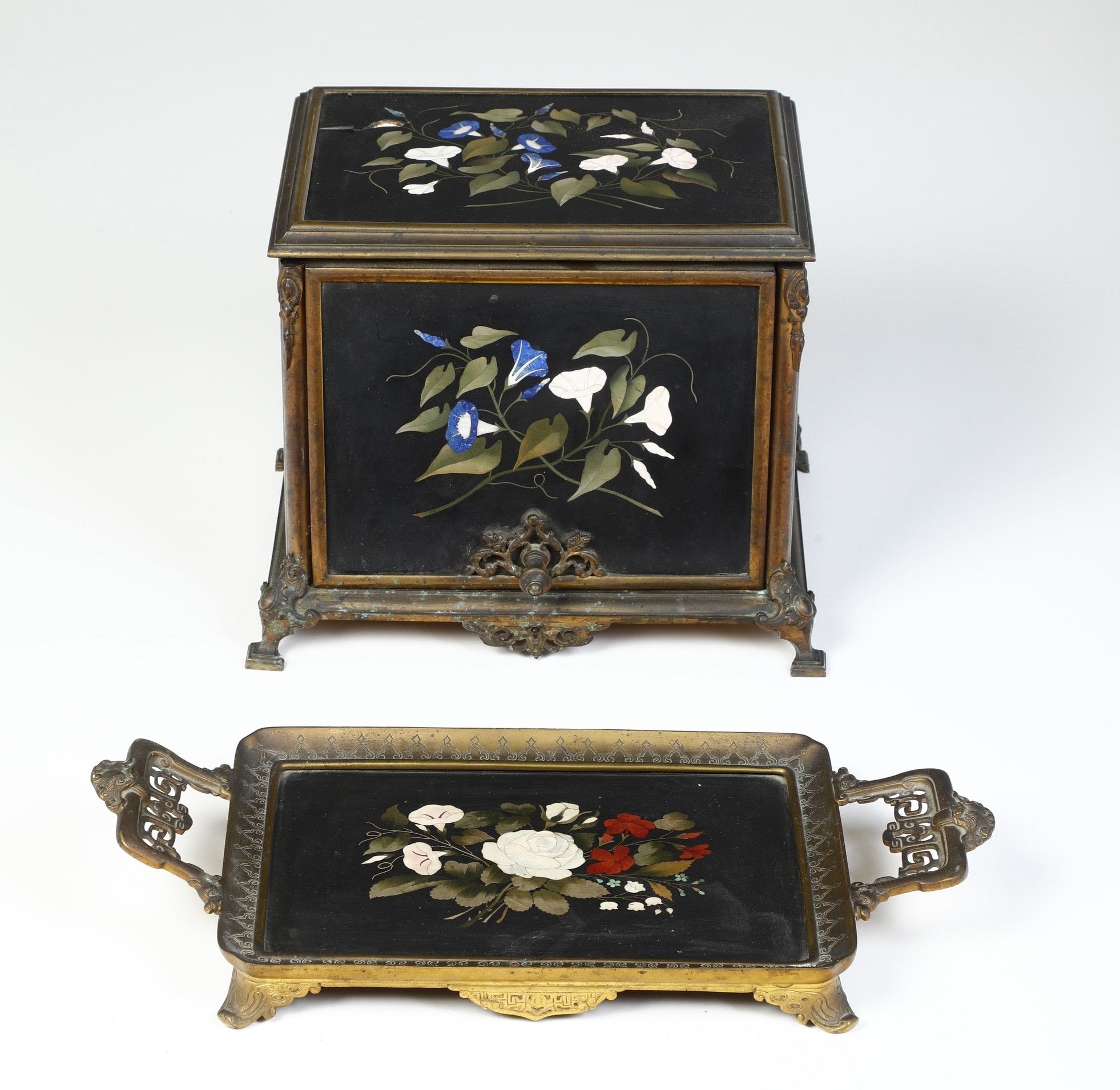 Cofanetto portaliquori e vassoio con pannelli intarsiati in pietre dure. Sotto la [..]