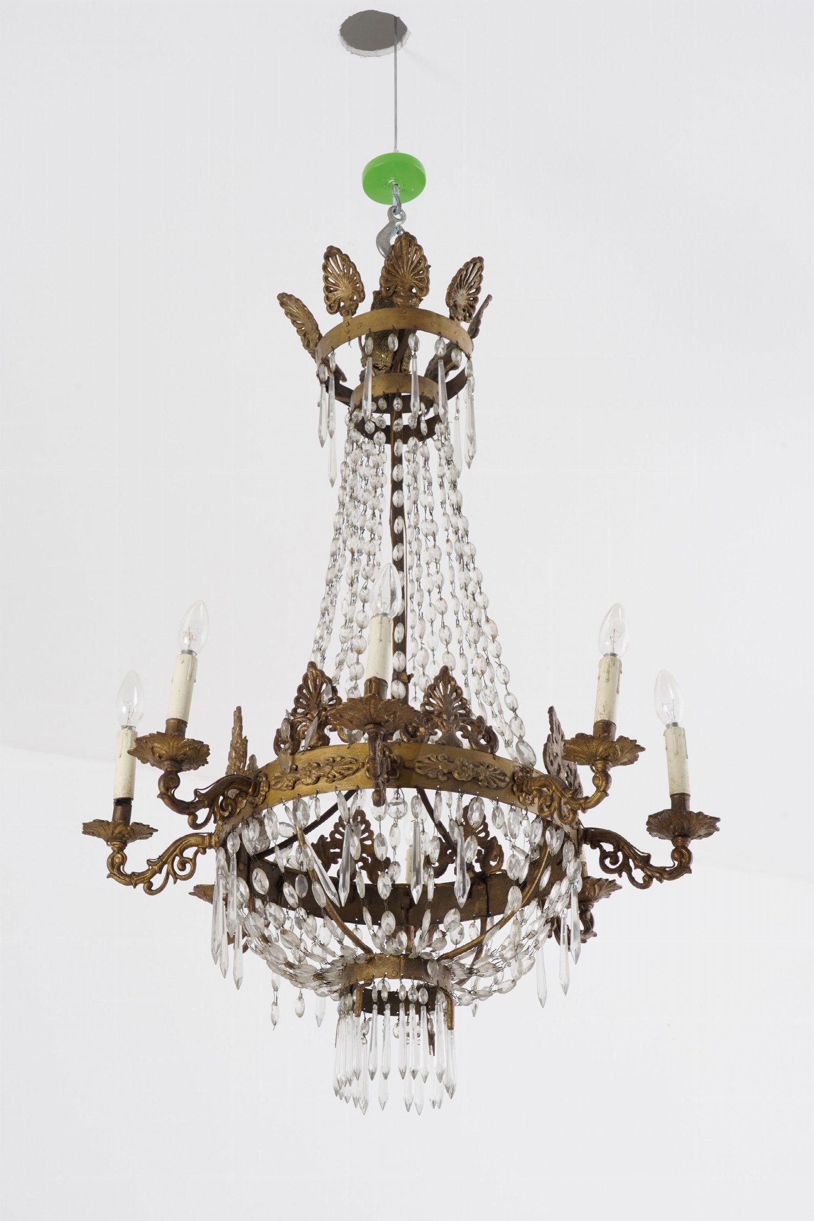 Coppia di lampadari a mongolfiera in metallo dorato e vetro. XIX secolo