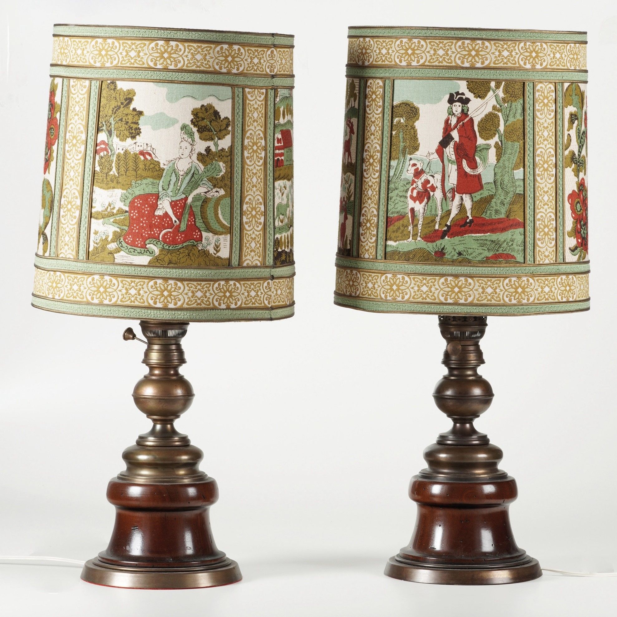 Coppia di lampade in bronzo e legno con paralume decorato a scene di caccia