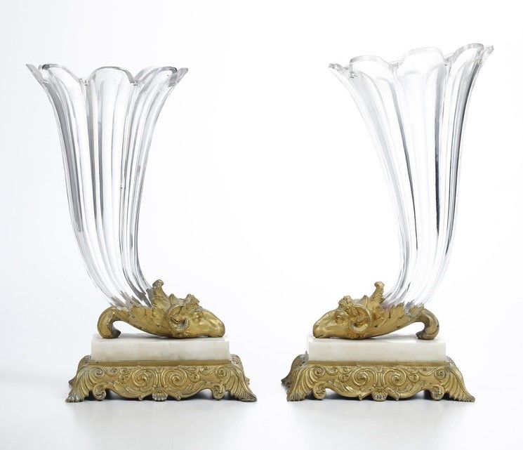 Coppia di vasi a cornucopia in bronzo e cristallo. Francia, XIX secolo