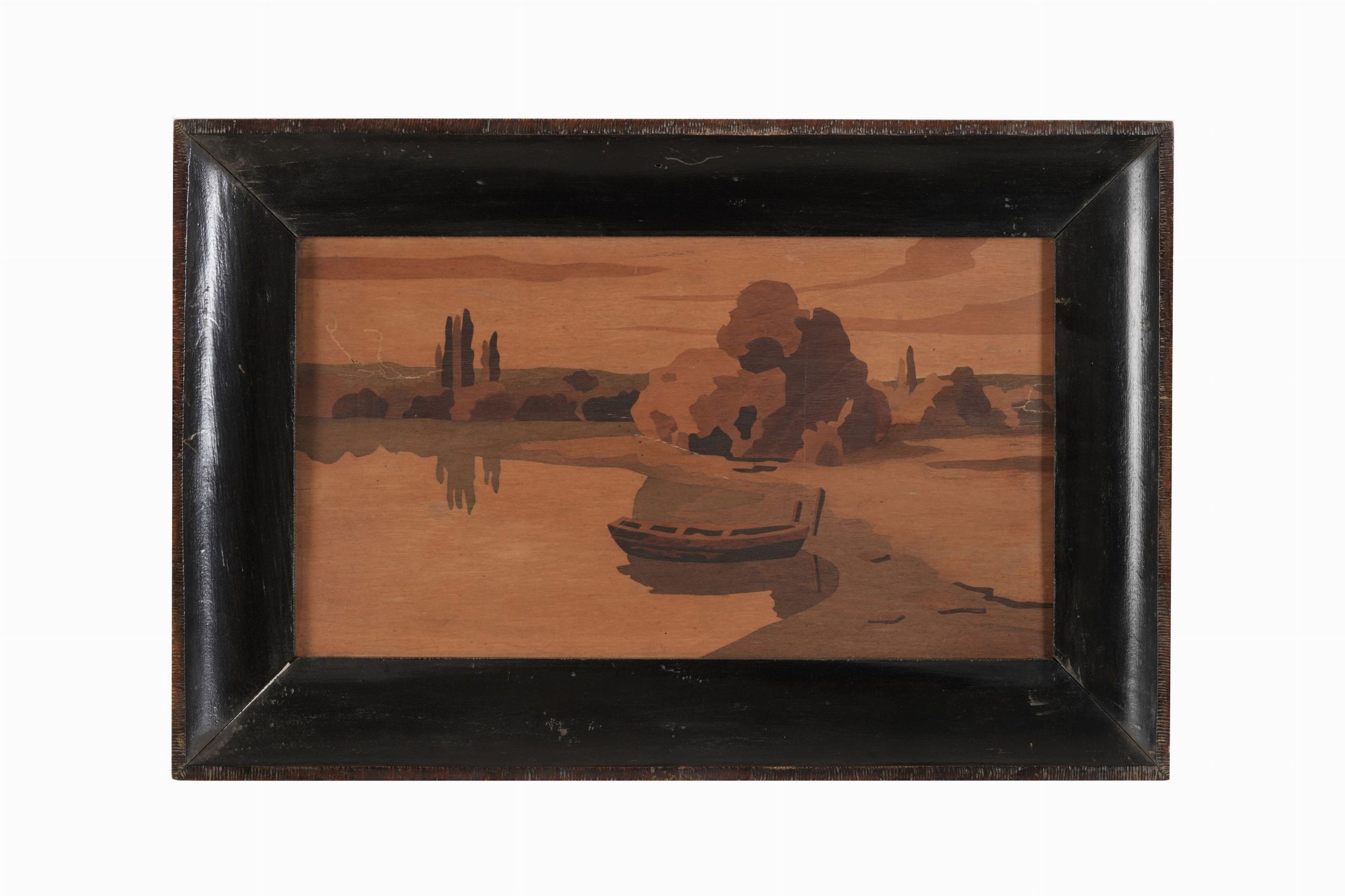 Due paesaggi fluviali in legno intarsiato. XX secolo