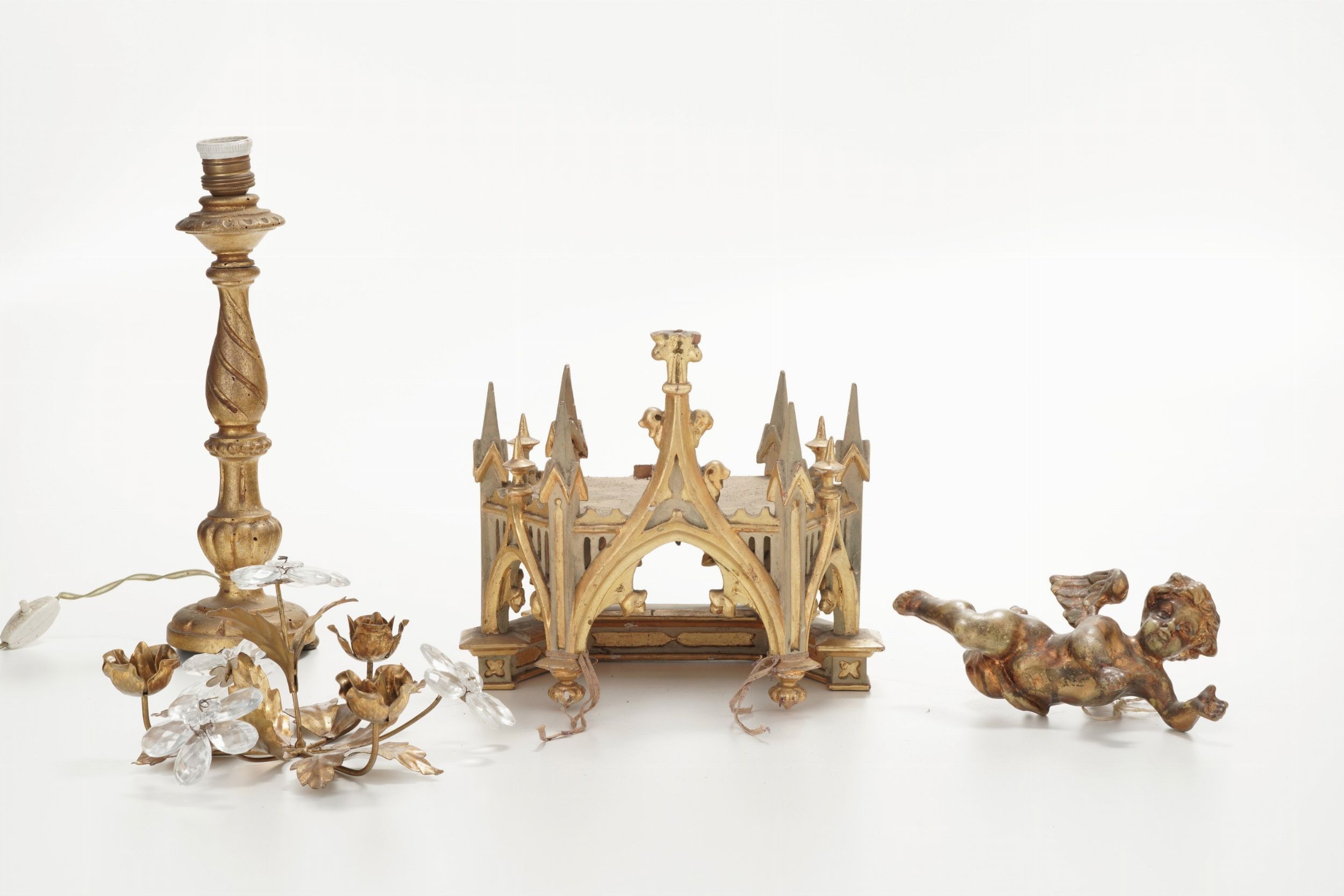 Gruppo di oggetti in legno intagliato e dorato tra cui candeliere montato a lampada, [..]