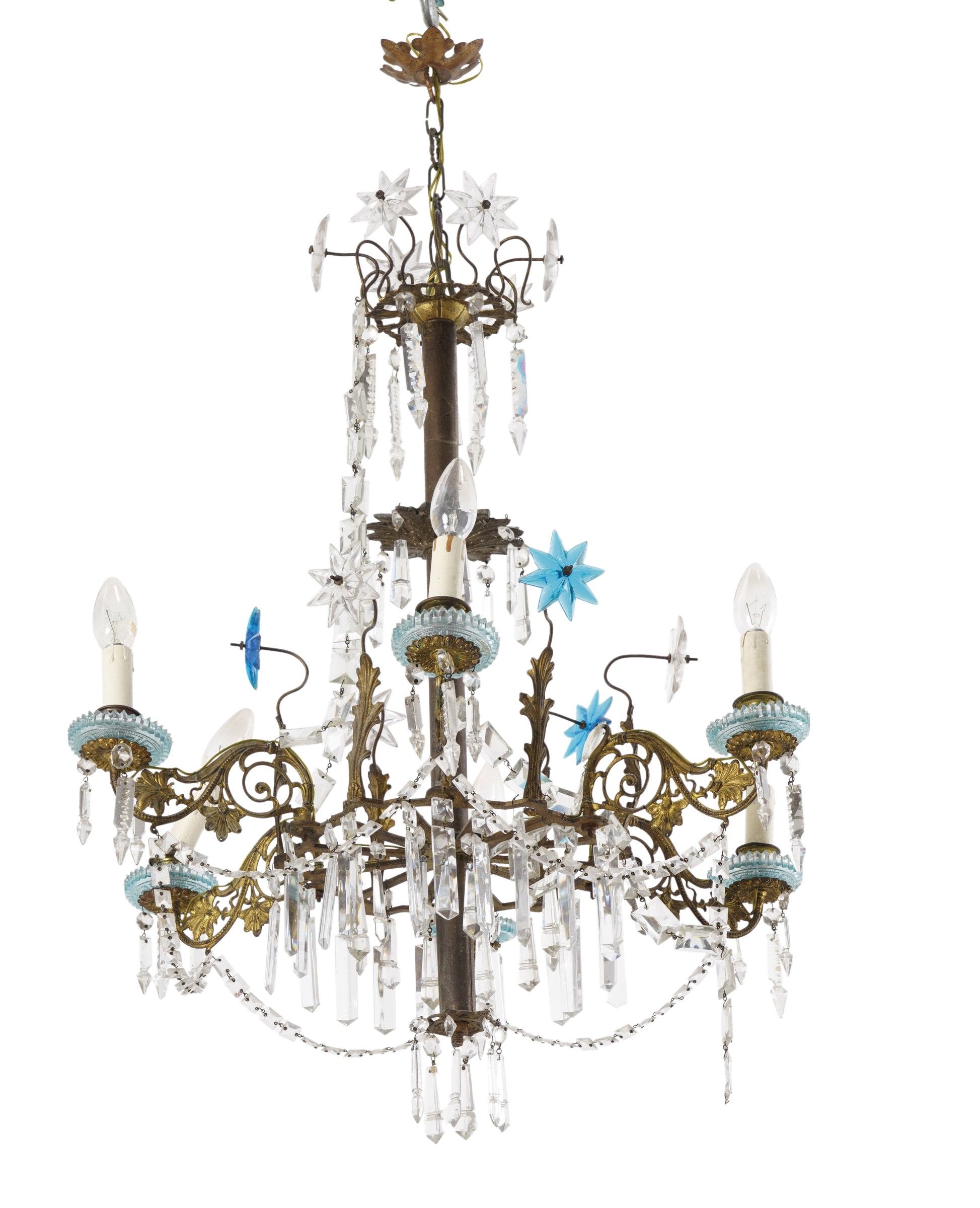 Lampadario in metallo dorato e vetro a sei luci. Inizio XX secolo